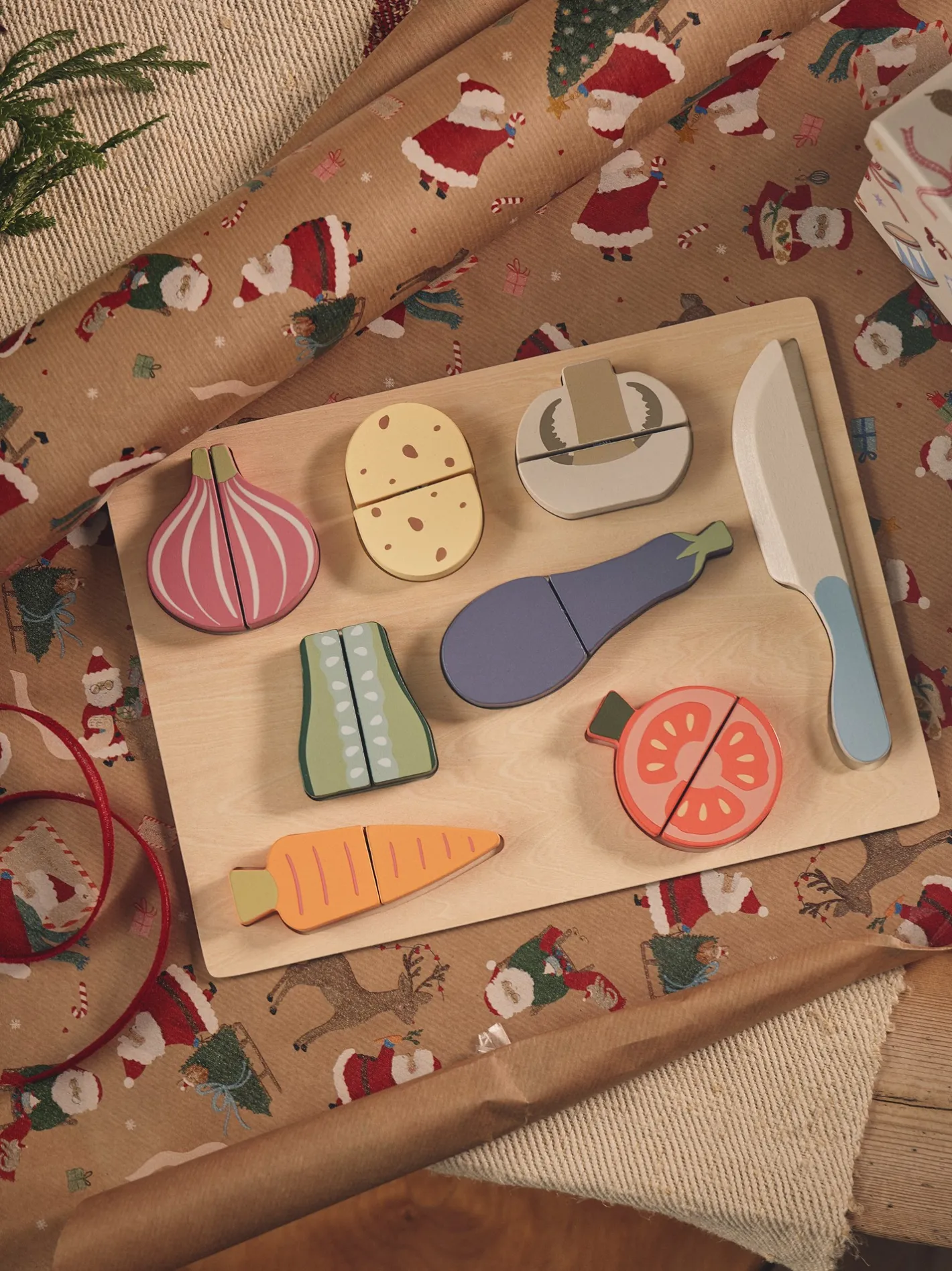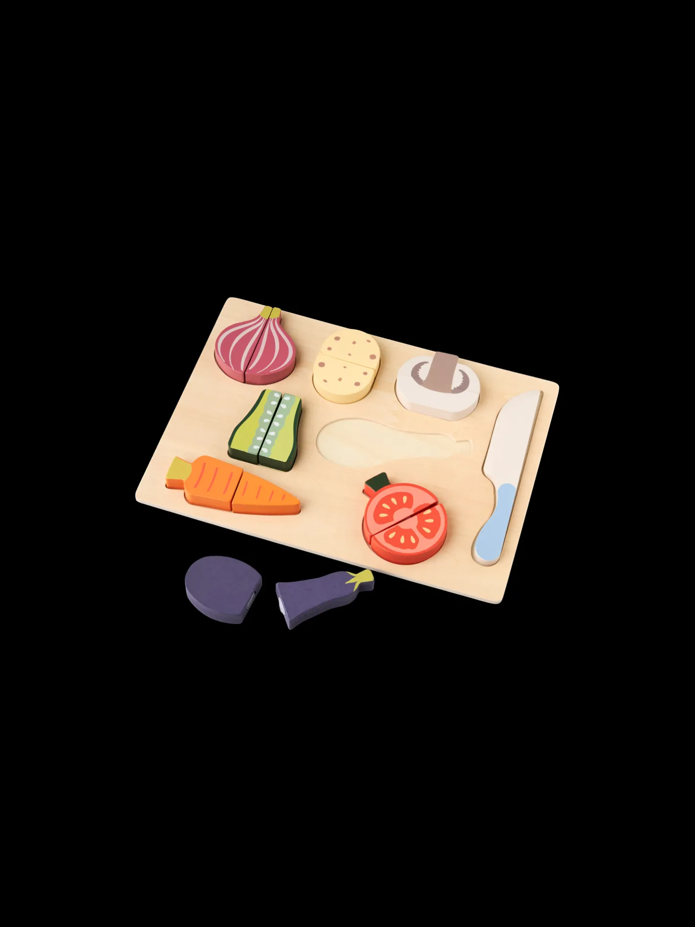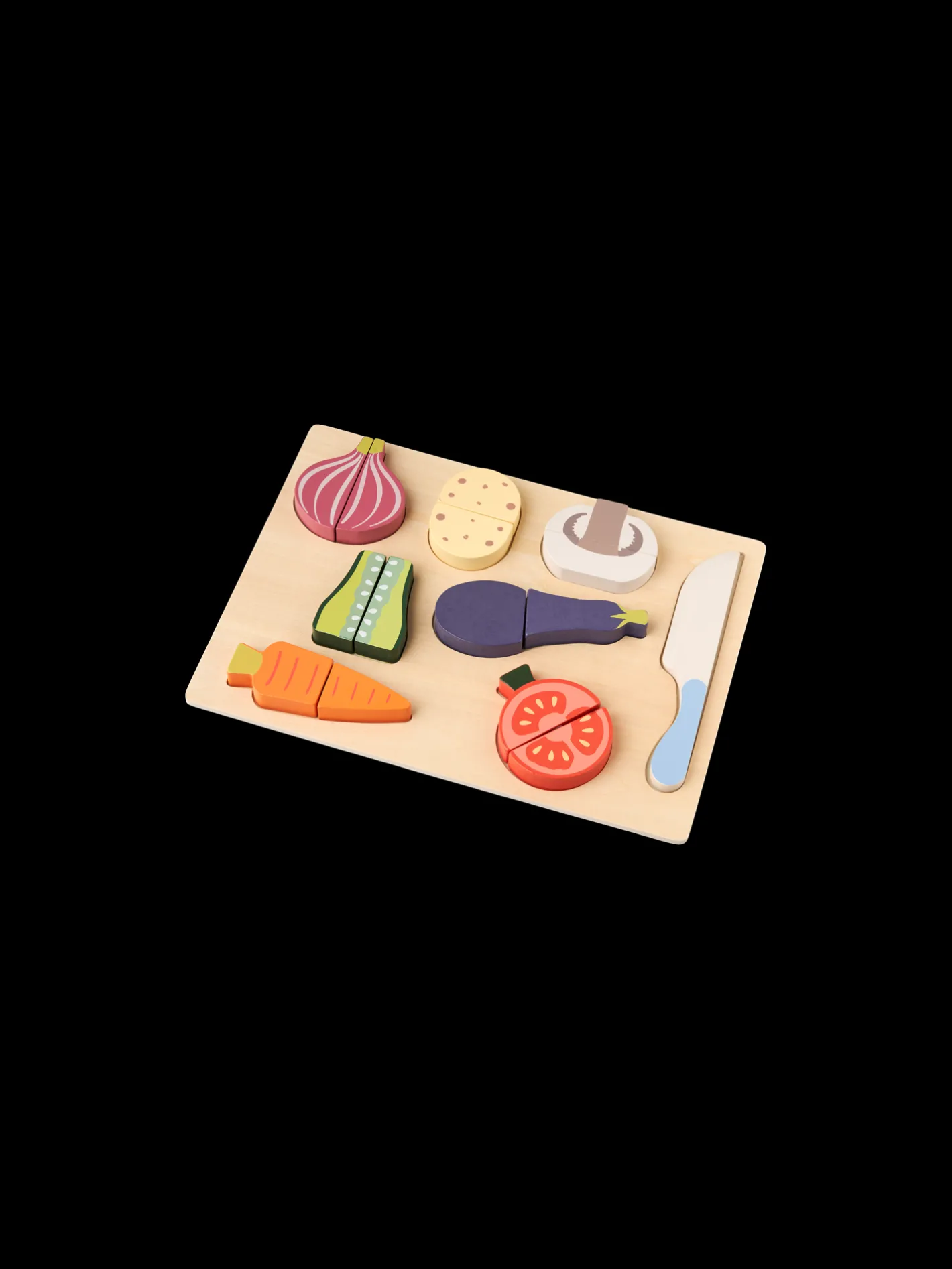 Søstrenes legetøjssæt med kniv og madvarer er lavet af FSC®-certificeret krydsfiner og MDF, og brættet måler 30 x 22 cm.Sættet består af 8 madvarer af træ og en legetøjskniv i træ, som de kære små kan bruge til at øve sig i madkunstens verden. Madvarerne er sat sammen med en burrelukning, så de kan deles i to. Lad dem øve sig i at skære madvarer af træ så de, når de er gamle nok, selvsikkert kan hjælpe Dem med at snitte rigtig mad i køkkenet.