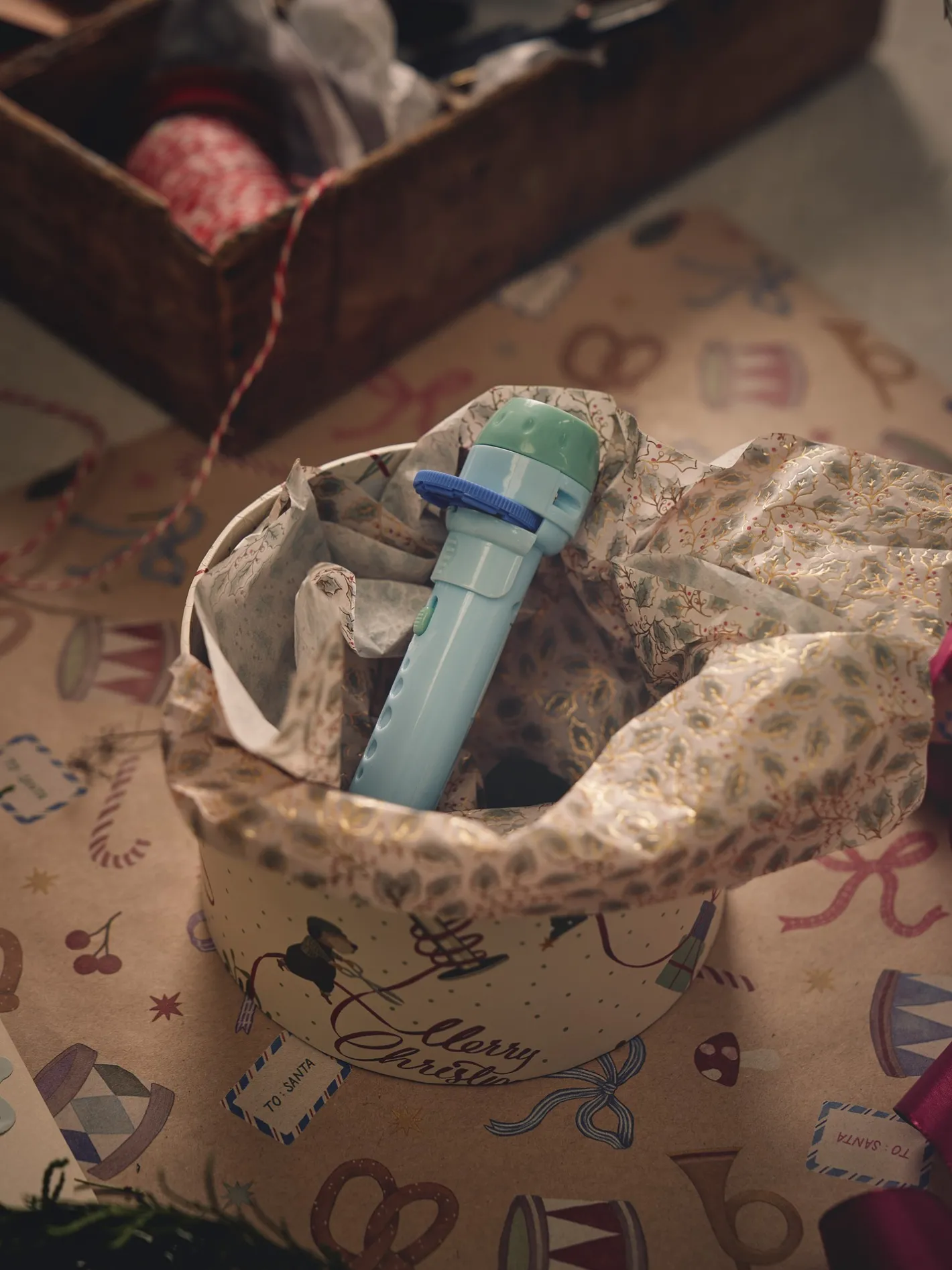 Søstrenes projektorlommelygte kommer med tre billedhjul med 8 forskellige billeder i hver.