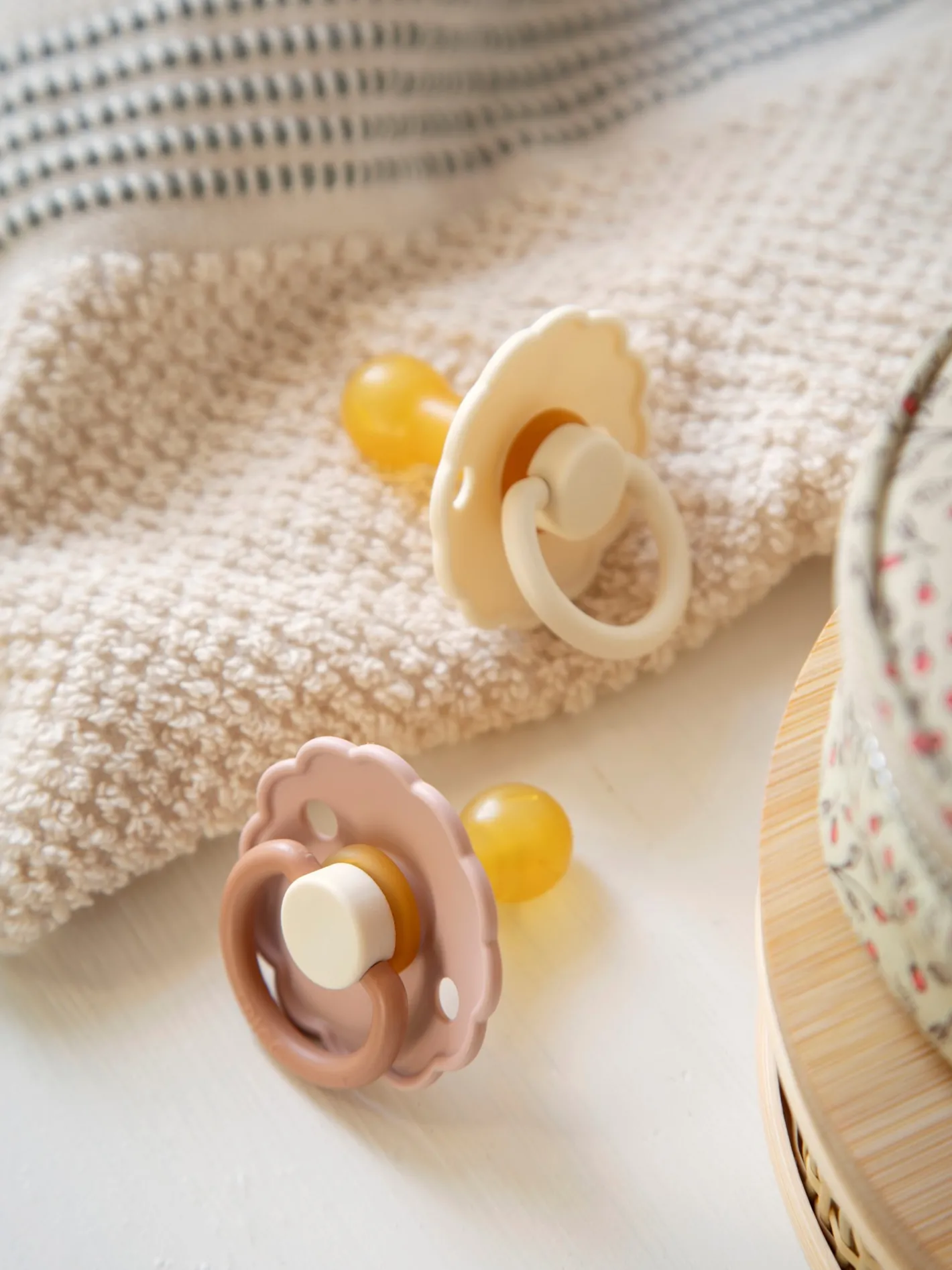 Daisy-sutterne fra det danske mærke FRIGG er designet og produceret i Danmark. Pakken indeholder 2 FRIGG-sutter. Sutterne har låsemekanismen click-lock® og en ny SilkySoft™ overflade. Sutten er lavet af 100% naturgummi og kommer i en størrelse 1, ideel til alderen 0-6 måneder. Sutten er rund og måler 27 mm. Daisy-sutterne fra FRIGG har yndige, flossede kanter, der minder om en særlig blomst: Tusindfryden, som er Danmarks nationalblomst. Denne pakke indeholder en Buiscuit-farvet sut og en Cream-farvet sut. Søstrene gør opmærksom på, at sutterne bør udskiftes hver 4.-8. uge af hygiejniske årsager og for optimal sikkerhed. De bør altid tjekke sutten før brug og kassere den ved første tegn på beskadigelse eller slid.