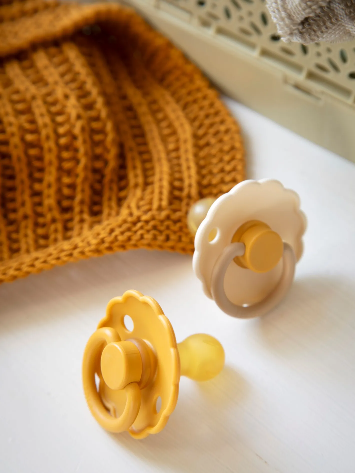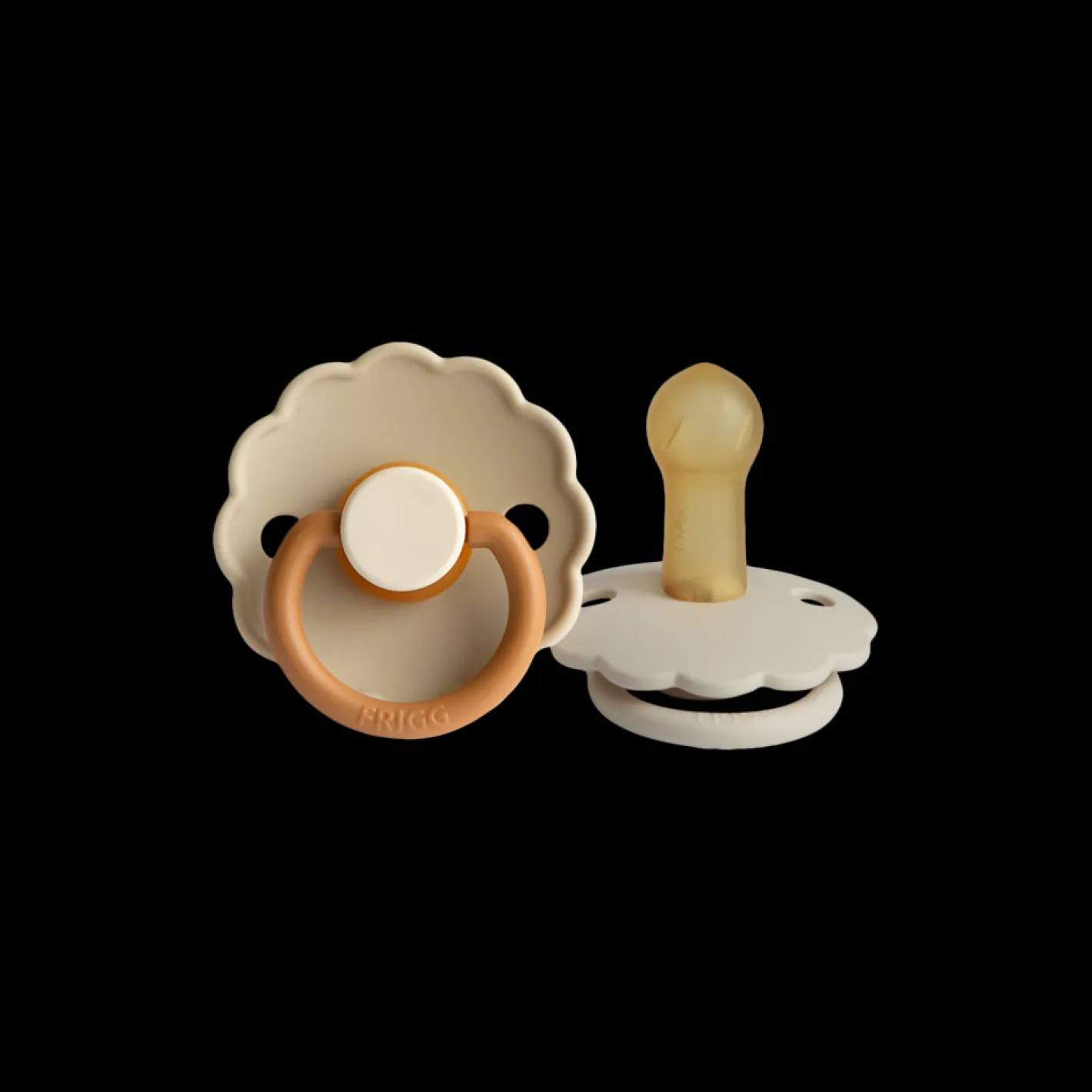 Daisy-sutterne fra det danske mærke FRIGG er designet og produceret i Danmark. Pakken indeholder 2 FRIGG-sutter. Sutterne har låsemekanismen click-lock® og en ny SilkySoft™ overflade. Sutten er lavet af 100% naturgummi og kommer i en størrelse 2, ideel til alderen 6-18 måneder. Sutten er rund og måler 30 mm. Daisy-sutterne fra FRIGG har yndige, flossede kanter, der minder om en særlig blomst: Tusindfryden, som er Danmarks nationalblomst. Denne pakke indeholder en Baby Desert-farvet sut og en Cream-farvet sut. Søstrene gør opmærksom på, at sutterne bør udskiftes hver 4.-8. uge af hygiejniske årsager og for optimal sikkerhed. De bør altid tjekke sutten før brug og kassere den ved første tegn på beskadigelse eller slid.