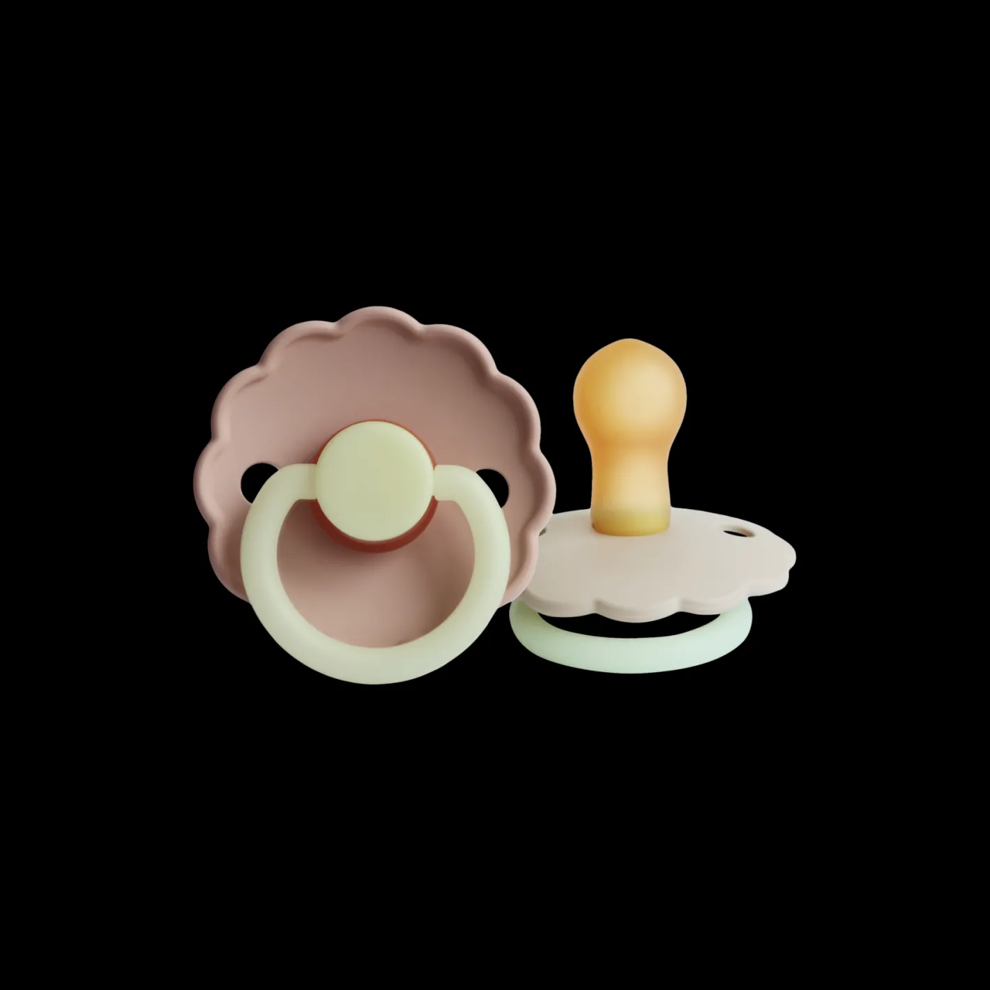 Daisy-sutterne fra det danske mærke FRIGG er designet og produceret i Danmark. Pakken indeholder 2 FRIGG-sutter. Sutterne har låsemekanismen click-lock® og en ny SilkySoft™ overflade. Sutten er lavet af 100% naturgummi og kommer i en størrelse 2, ideel til alderen 6-18 måneder. Sutten er rund og måler 30 mm. Sutterne er også udstyret med en blid, selvlysende funktion, der ikke skader den lilles øjne. Håndtaget og knoppen kan lyse i mørke og dermed hjælpe med at finde, og give, din babys sut midt om natten.Daisy-sutterne fra FRIGG har yndige, flossede kanter, der minder om en særlig blomst: Tusindfryden, som er Danmarks nationalblomst. Denne pakke indeholder en Blush Night-farvet sut og en Cream Night-farvet sut. Søstrene gør opmærksom på, at sutterne bør udskiftes hver 4.-8. uge af hygiejniske årsager og for optimal sikkerhed. De bør altid tjekke sutten før brug og kassere den ved første tegn på beskadigelse eller slid.