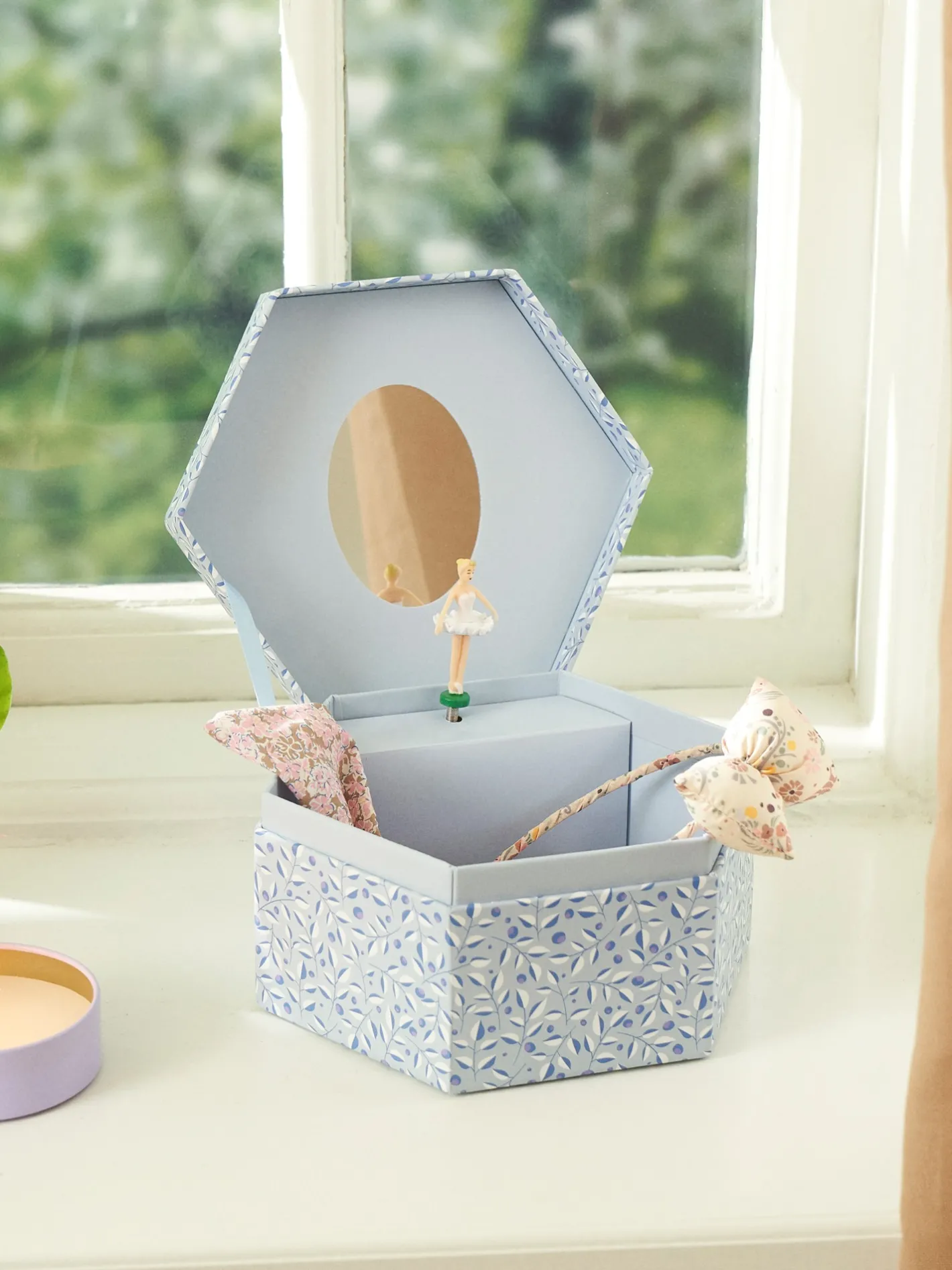 Søstrenes smykkeskrin med musik er lavet af FSC®-certificeret papir samt glas, polypropylen og polyester.Når smykkeskrinet åbnes, snurrer den lille balletdanser forsigtigt rundt til tonerne af den spillende musik.