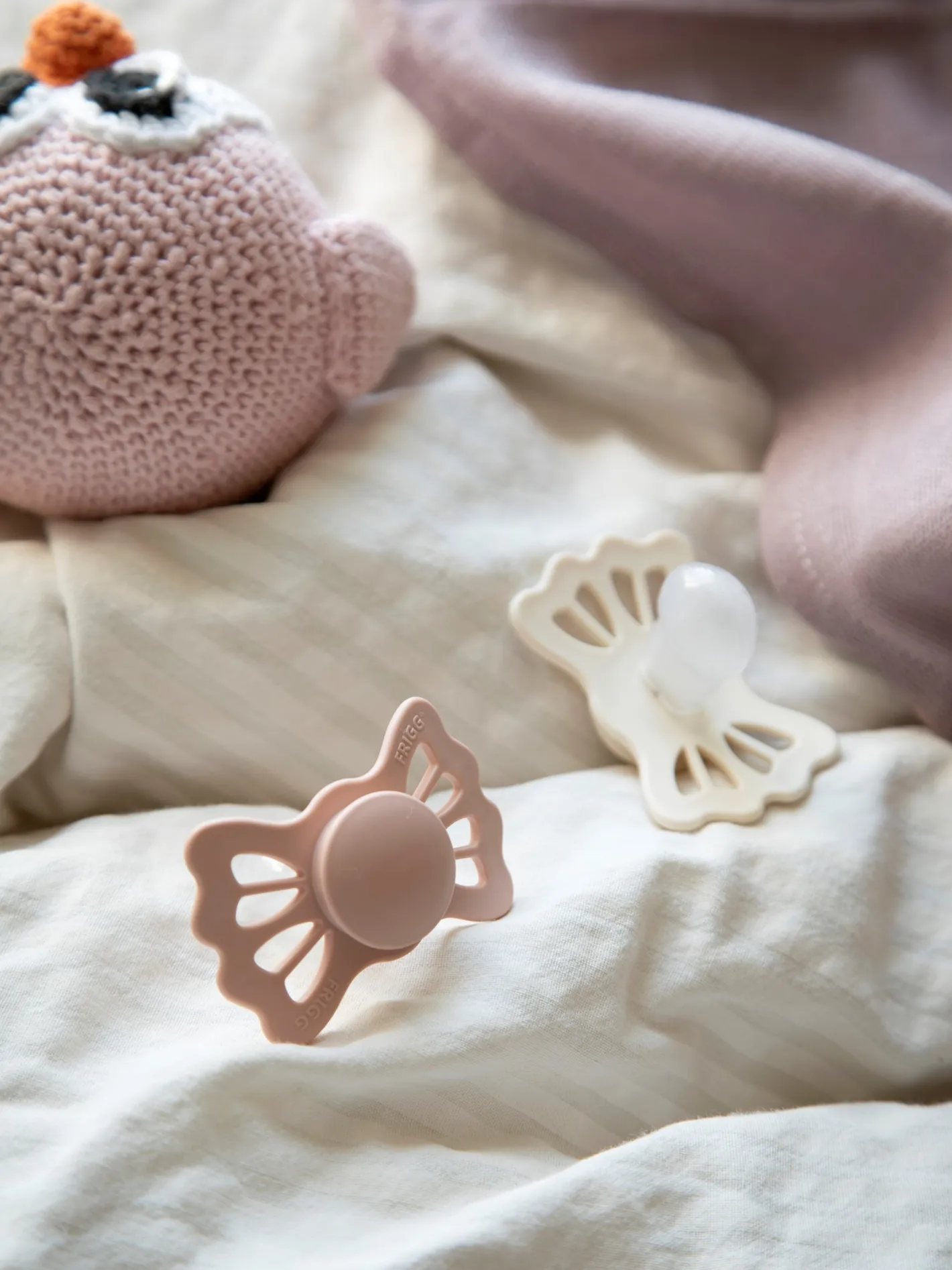 Lucky-sutterne fra det danske mærke FRIGG er designet og produceret i Danmark. Pakken indeholder 2 FRIGG-sutter. Sutterne har låsemekanismen click-lock® og en ny SilkySoft™ overflade. Sutten er lavet af medicinsk silikone og kommer i en størrelse 2, ideel til alderen 6-18 måneder. Sutten har en symmetrisk form og måler 27 mm. Lucky-sutterne fra FRIGG er inspireret af firkløveren. Denne pakke indeholder en Cream-farvet sut og en Blush-farvet sut. Søstrene gør opmærksom på, at sutterne bør udskiftes hver 4.-8. uge af hygiejniske årsager og for optimal sikkerhed. De bør altid tjekke sutten før brug og kassere den ved første tegn på beskadigelse eller slid.