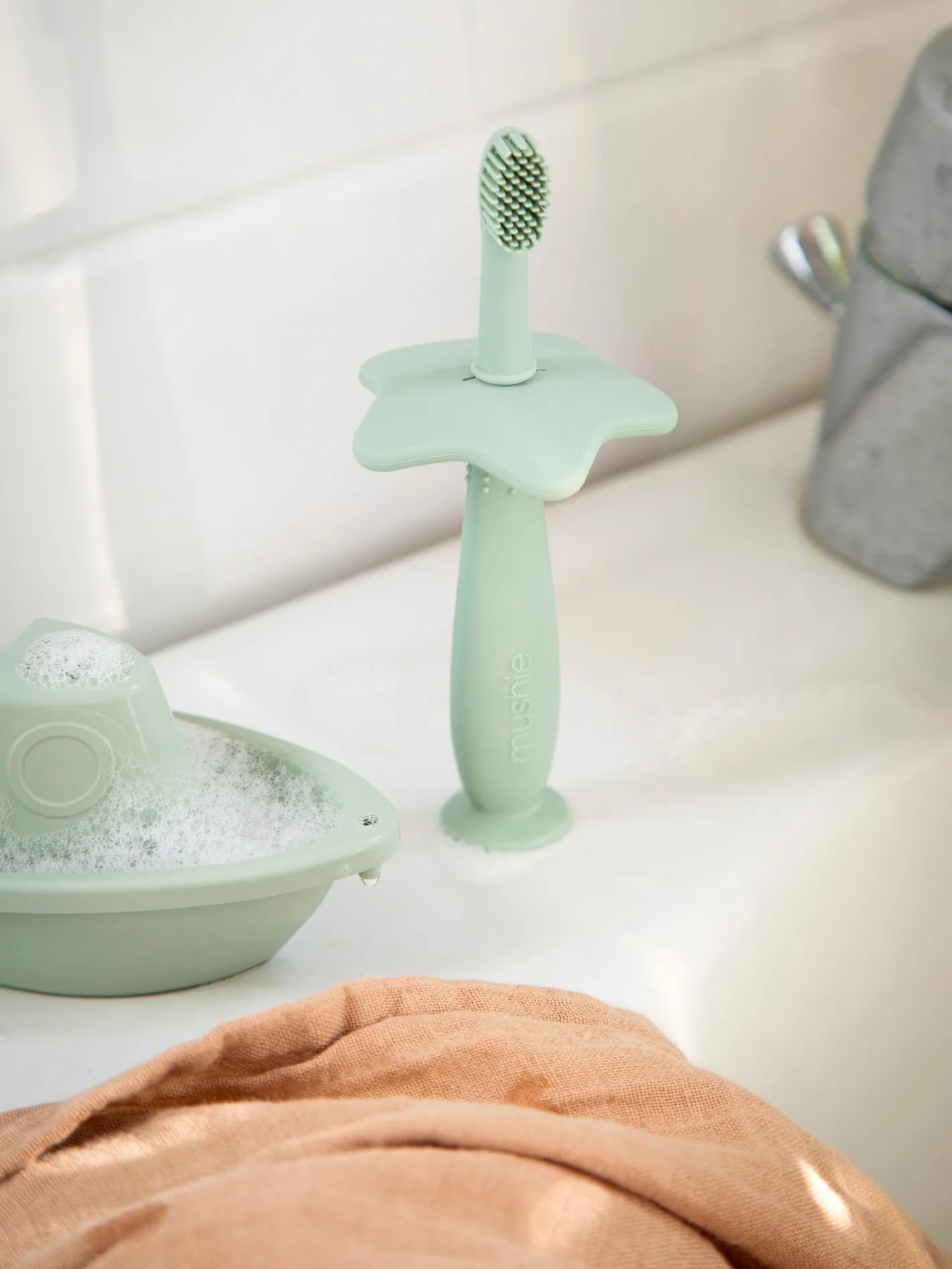 Tandbørsten fra Mushie er lavet af fødevaregodkendt silikone. Den er velegnet til alle aldre. Introducér de små til selvstændig børstning, og opbyg gode vaner med den børnevenlige tandbørste. De bløde børster renser og stimulerer blidt den lilles tandkød og tænder. Silikonesugekoppen er praktisk, og den aftagelige sikkerhedsskærm kan forhindre kvælning, hvilket gør denne tandbørste sikker og nem at bruge. Søstrene anbefaler at rengøre den med varmt sæbevand og lade den lufttørre. Bemærk venligst, at produktet altid skal bruges under opsyn af en voksen. Undersøg produktet før hver brug. Afskaf ved tegn på skade eller svaghed.