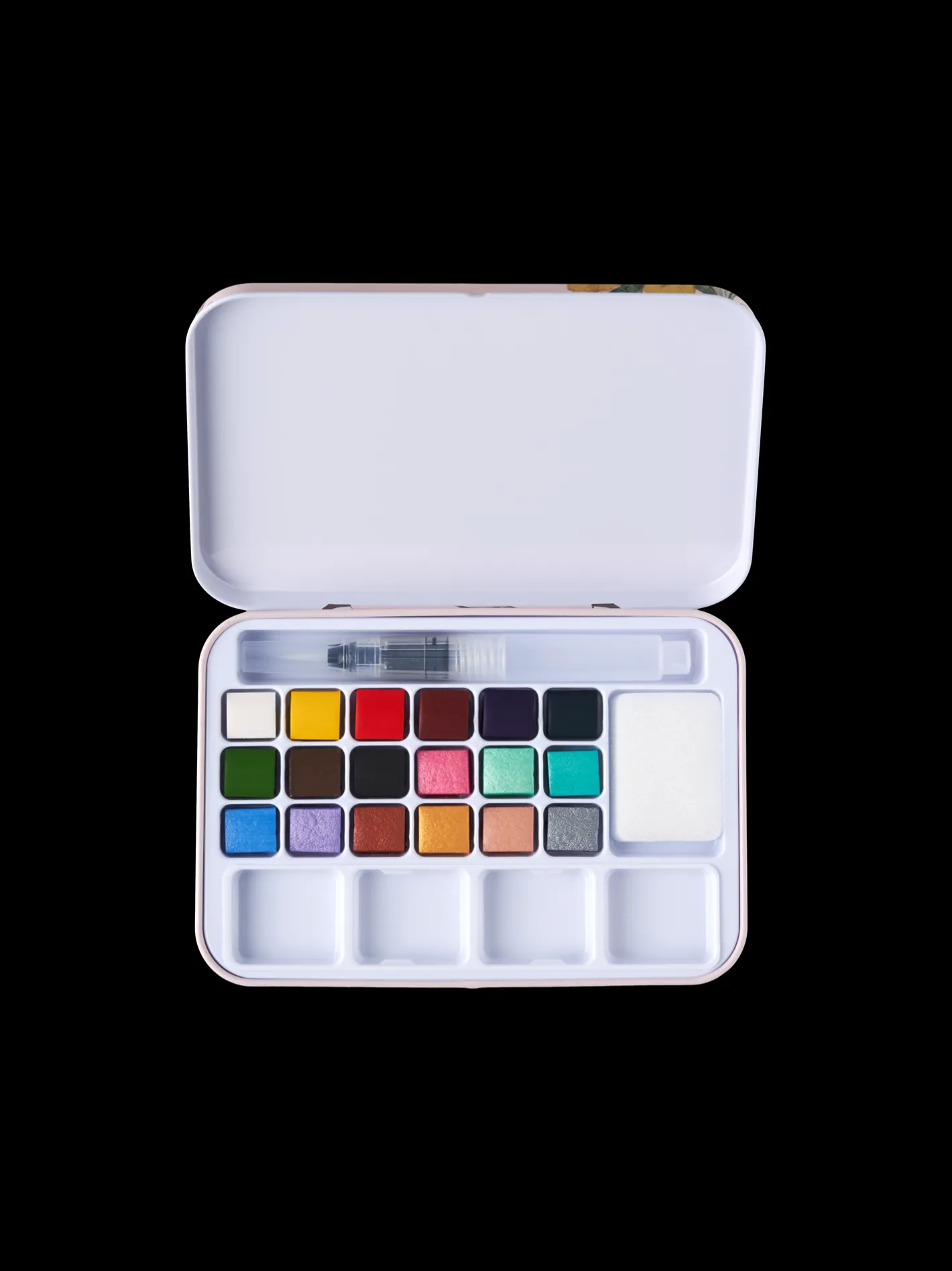 Søstrenes akvarelsæt består af 9 perlemorsfarver og 9 solide farver. Den kommer sammen med en pensel til vandfarver.