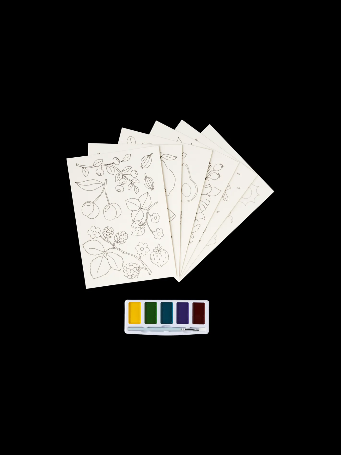 Søstrenes akvarelsæt indeholder 6 ark med sjove illustrationer samt 5 farver og en pensel.