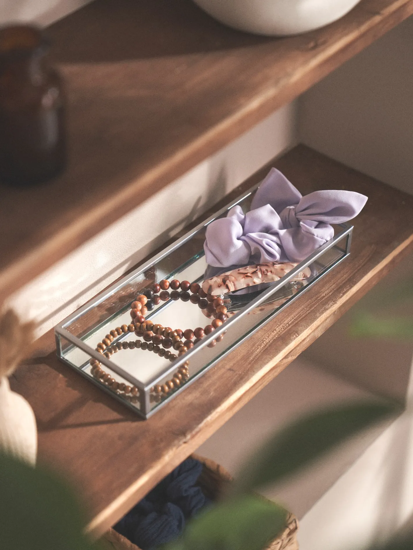 Søstrenes dekorative bakke er lavet af glas og jern og måler 9 x 24 x 3 cm.