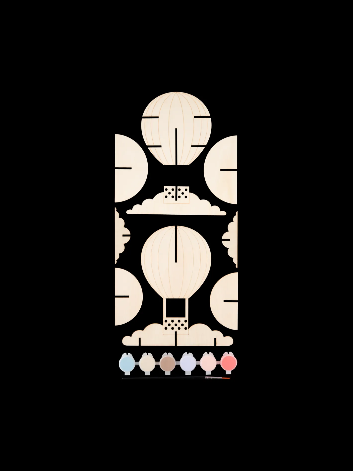 Søstrenes DIY-byggesæt i træ er 100 % FSC®-certificeret. Sættet indeholder træplader med udskårne former til at bygge en herlig luftballon samt en pensel og 6 stk. vandbaseret akrylmaling.
