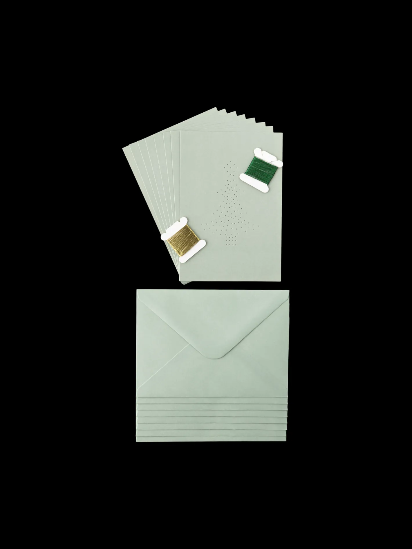 Søstrenes DIY-sæt indeholder 8 kort og 8 kuverter lavet af 100% FSC®-certificeret papir samt 2 bundter broderitråd. Kortene måler 16 x 11 cm, når de er foldet.