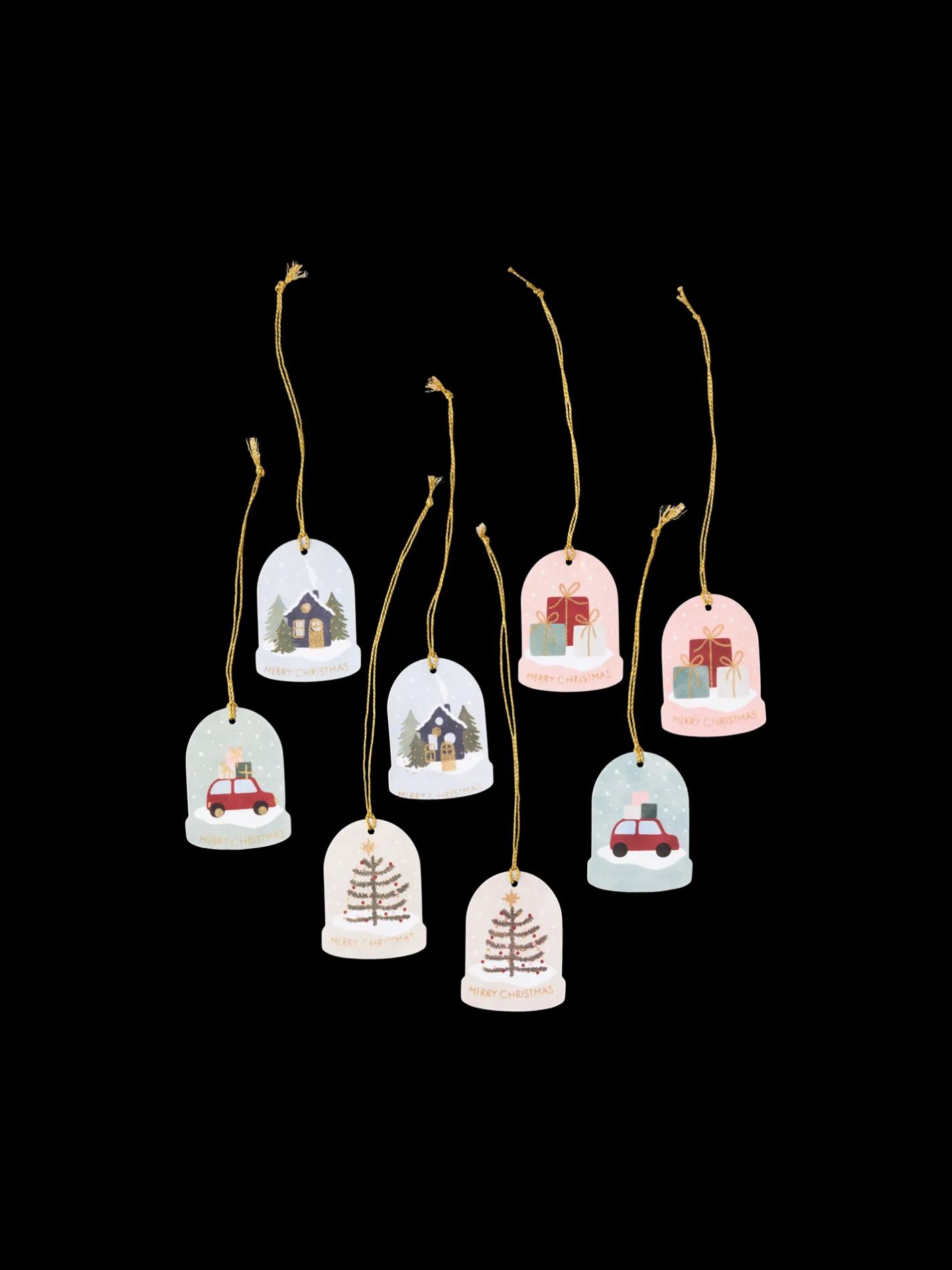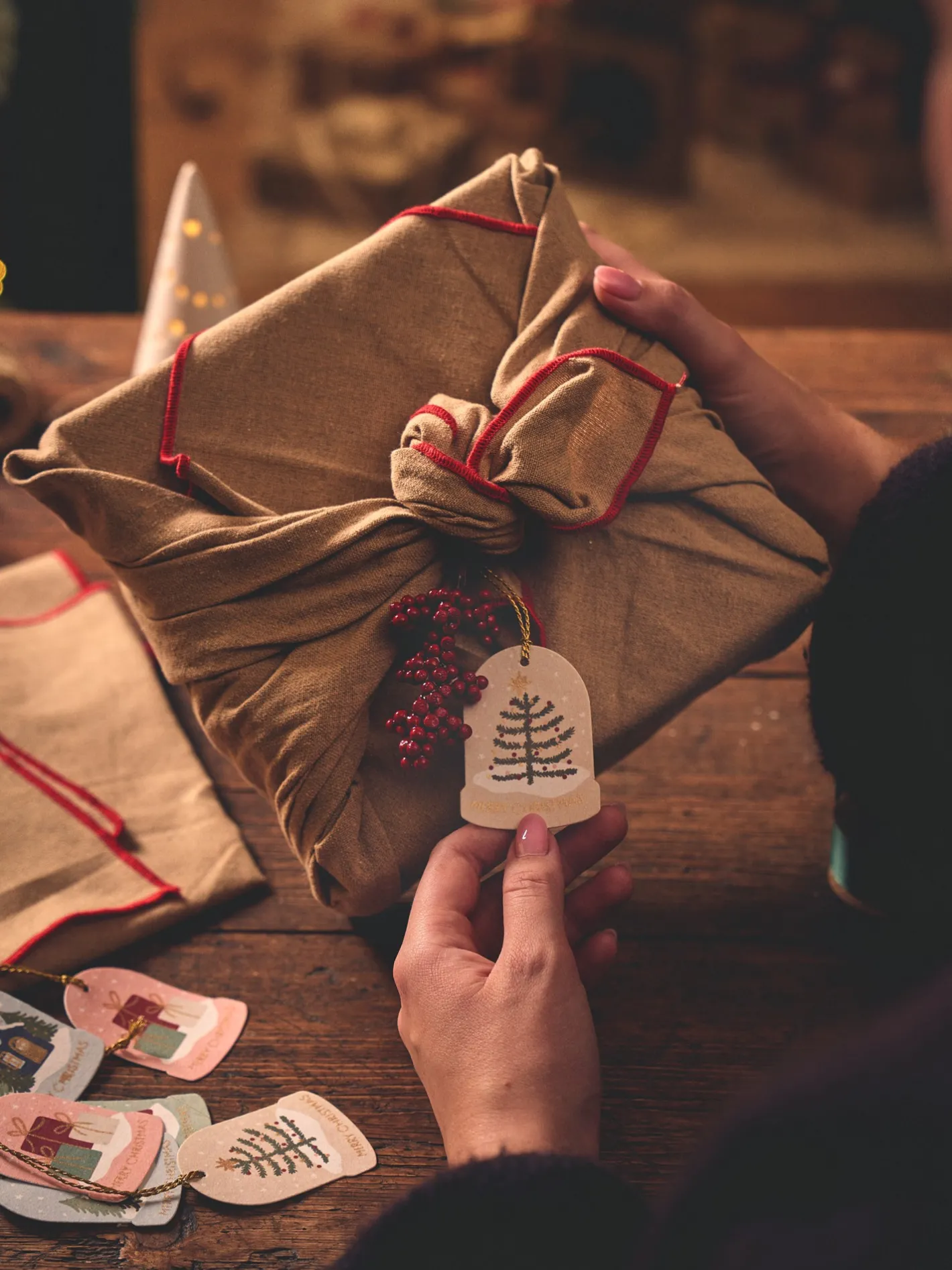 Søstrenes gavemærker er lavet af 100% GRS-certificeret* bomuld. Gavemærkerne er formet som snekugler for et festligt udtryk. *Certified by Ecocert Greenlife, license number 197533