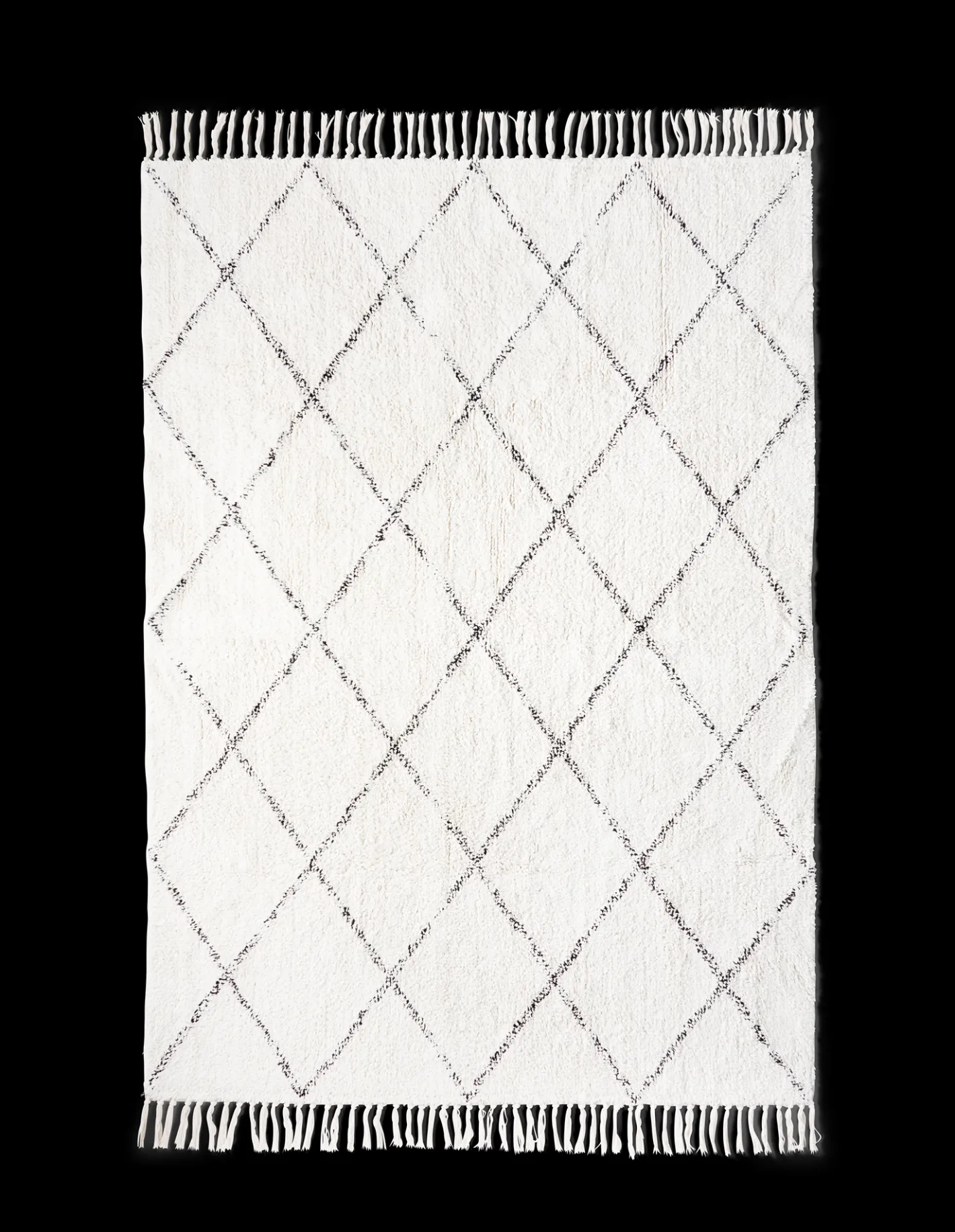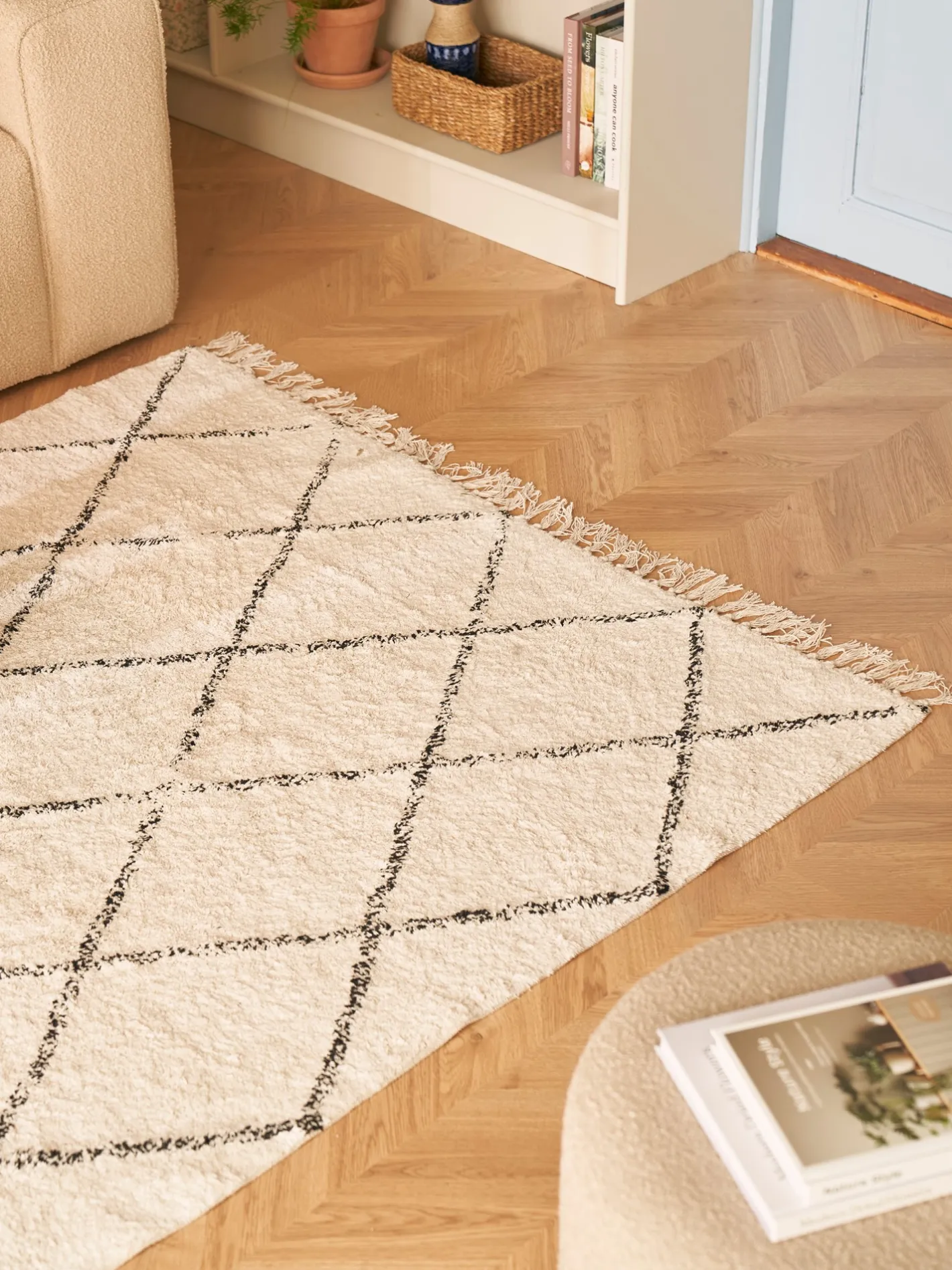 Anna og Clara har indrettet deres entré med varme nuancer og naturlige materialer. Søstrene har lagt bløde gulvtæpper på gulvet og hængt fint flet på væggene. “Det skaber en ro og varme, som er dejligt indbydende for Deres gæster,” siger Clara. Dette gulvtæppe har Clara iklædt romber, da hun synes, at det pynter så fint på gulvet. Søstrenes gulvtæppe er fremstillet i bomuld og måler 190 x 135 cm.