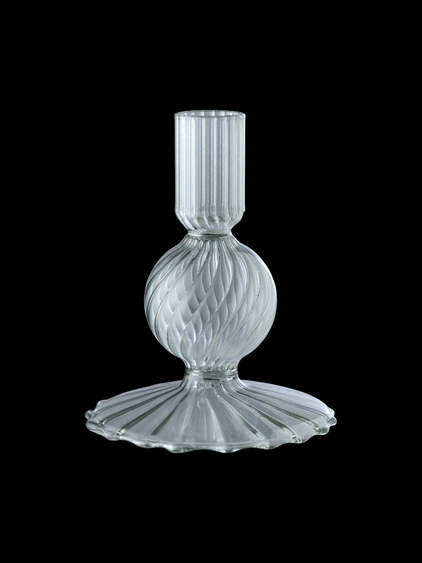 Søstrenes lysestage i glas måler 9 cm i diameter og 11 cm i højden.