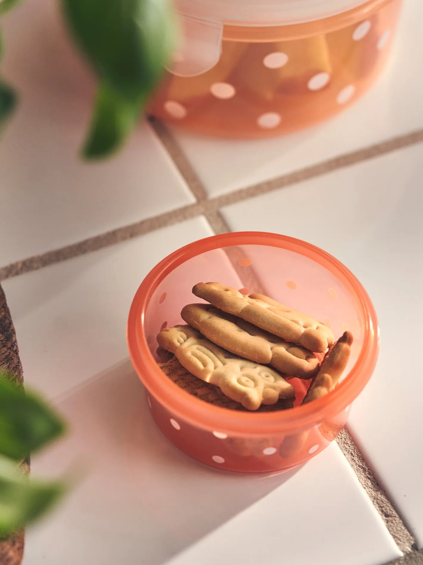 Gem rester fra gårsdagens middag, eller tag en snack med på farten med søstrenes madkasser. Denne beholder måler Ø8 cm og er skøn til en lille snack.