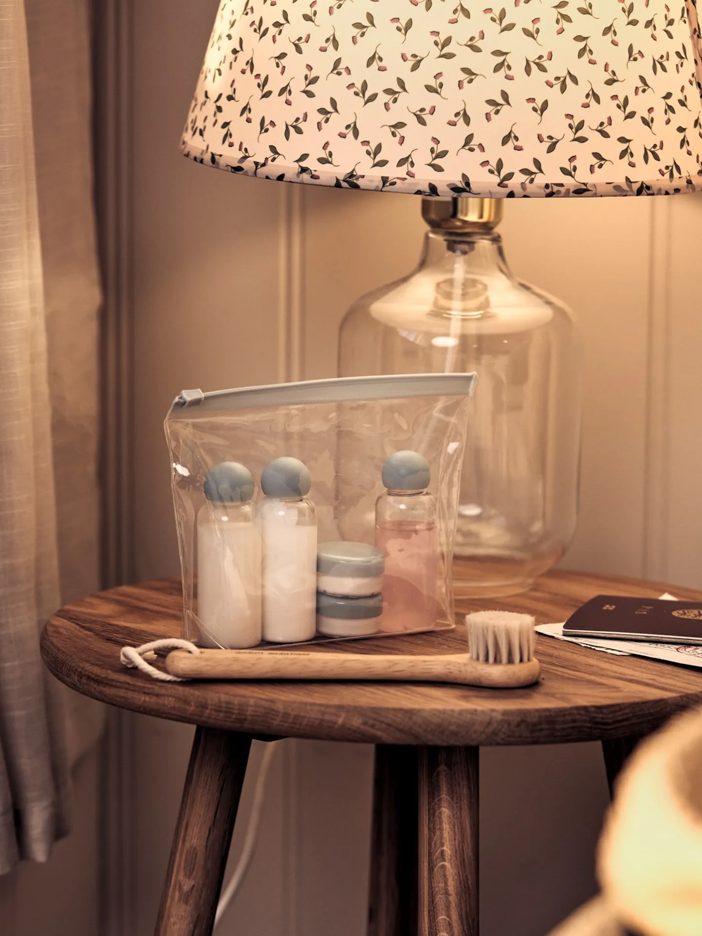 Søstrenes rejsesæt indeholder fem beholdere og en lille ske i en gennemsigtig pose.