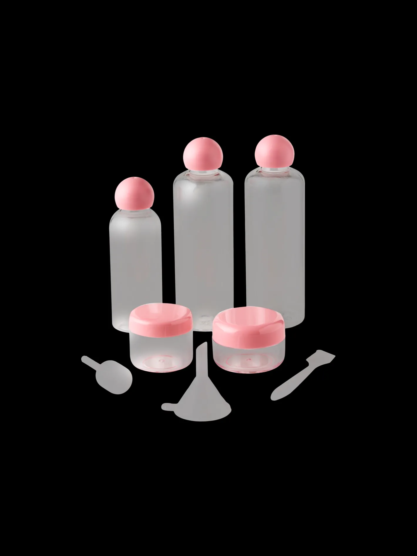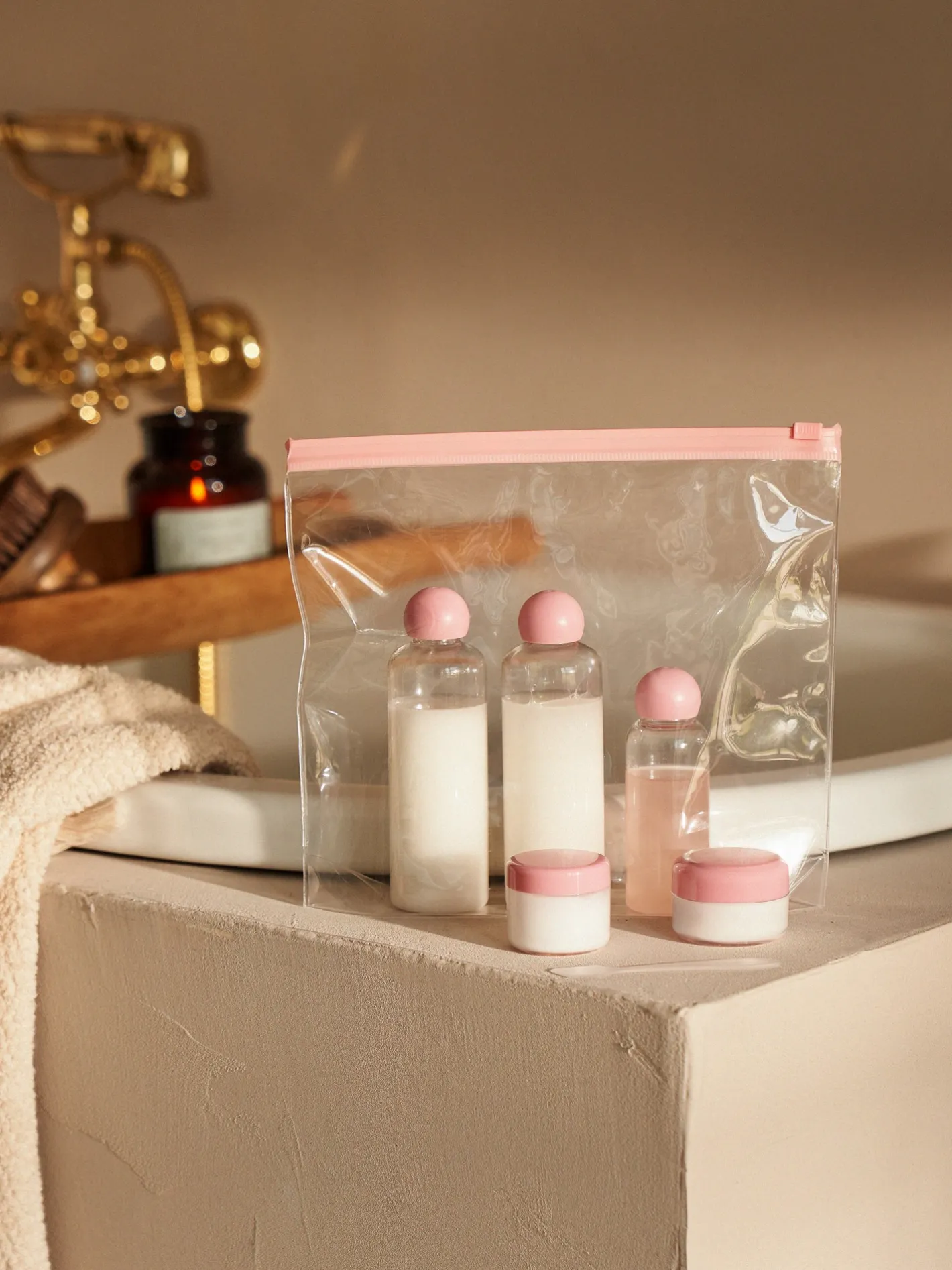 Søstrenes rejsesæt indeholder fem små beholdere i en gennemsigtig pose. To beholdere måler 100 ml, en måler 60 ml, en måler 25 ml, og en måler 20 ml.