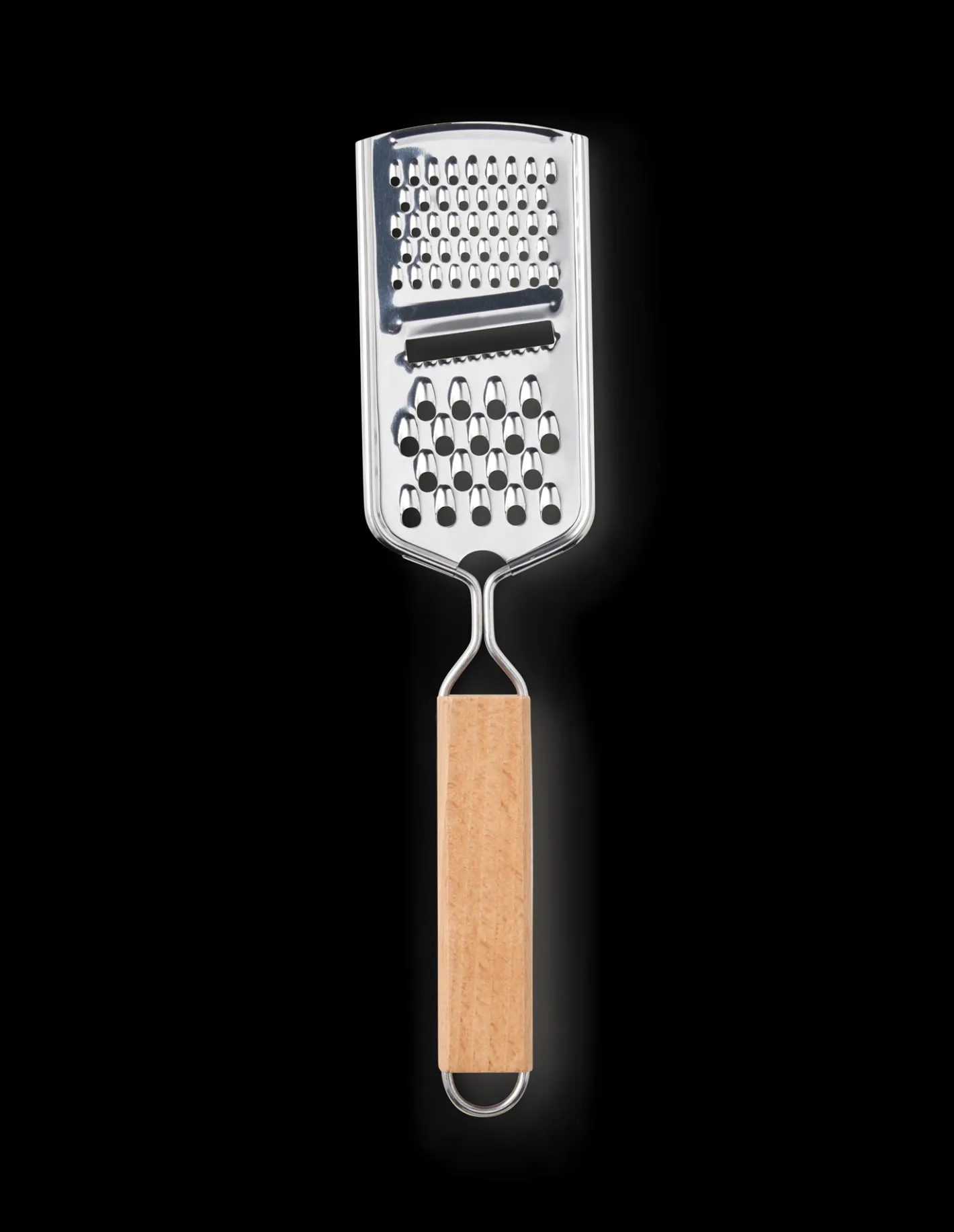 Clara bager friske boller og muffins inden niecernes besøg. Den altid organiseret søster ser bagning som en vidunderlig hobby. ”Bagning kræver meget præcise metoder og måling af ingredienser,” smiler hun idet hun kommer chokoladestykker i muffin dejen. ”Det er en slags videnskab.” Når hun skal bruge citronskal i sine bageopskrifter, bruger Clara som regel dette fine rivejern. ”Rivejernet har to sider med huller i forskellige størrelser,” forklarer hun. ”Brug den til nemt at rive Deres citroner eller ost.” Søstrenes rivejern er lavet af rustfrit stål med et håndtag af bøgetræ og måler 23,5 cm.