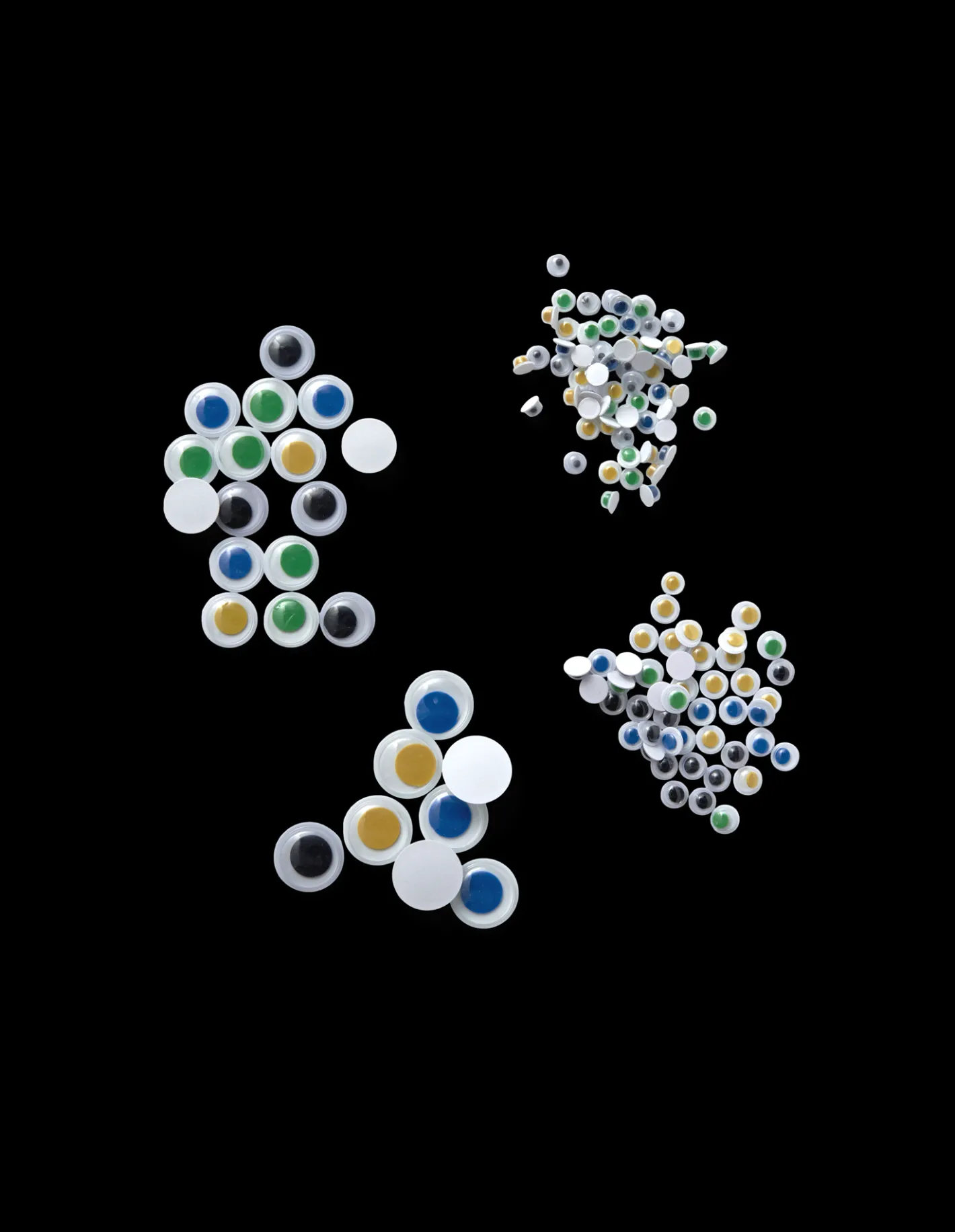 Disse sjove rulleøjne kommer i 4 forskellige farver og i forskellige størrelser: 8xØ1,6 cm, 16xØ1,2 cm, 46xØ0,6 cm og 60xØ0,5 cm.