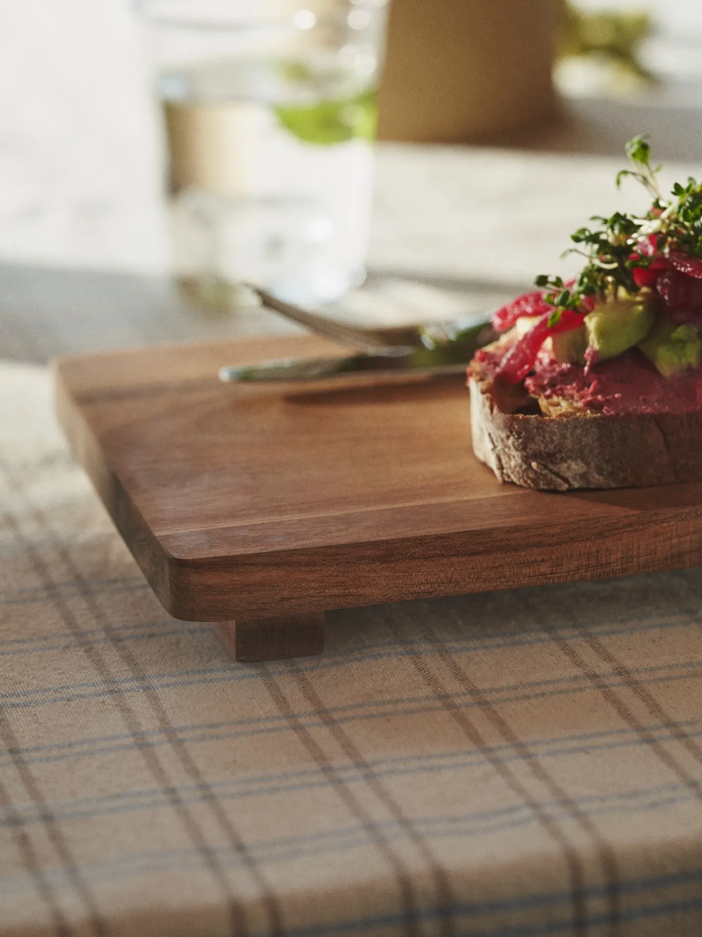 Søstrenes skærebræt er lavet af FSC®-certificeret akacietræ og måler 30 x 16 x 3 cm.Da det har små ben, er det let forhøjet, hvilket gør det til en fin måde at servere små retter på og tilføre bordet et strejf af elegance.Søstrene gør venligst opmærksom på, at da akacietræ er et naturmateriale, kan det variere i farve og udtryk.