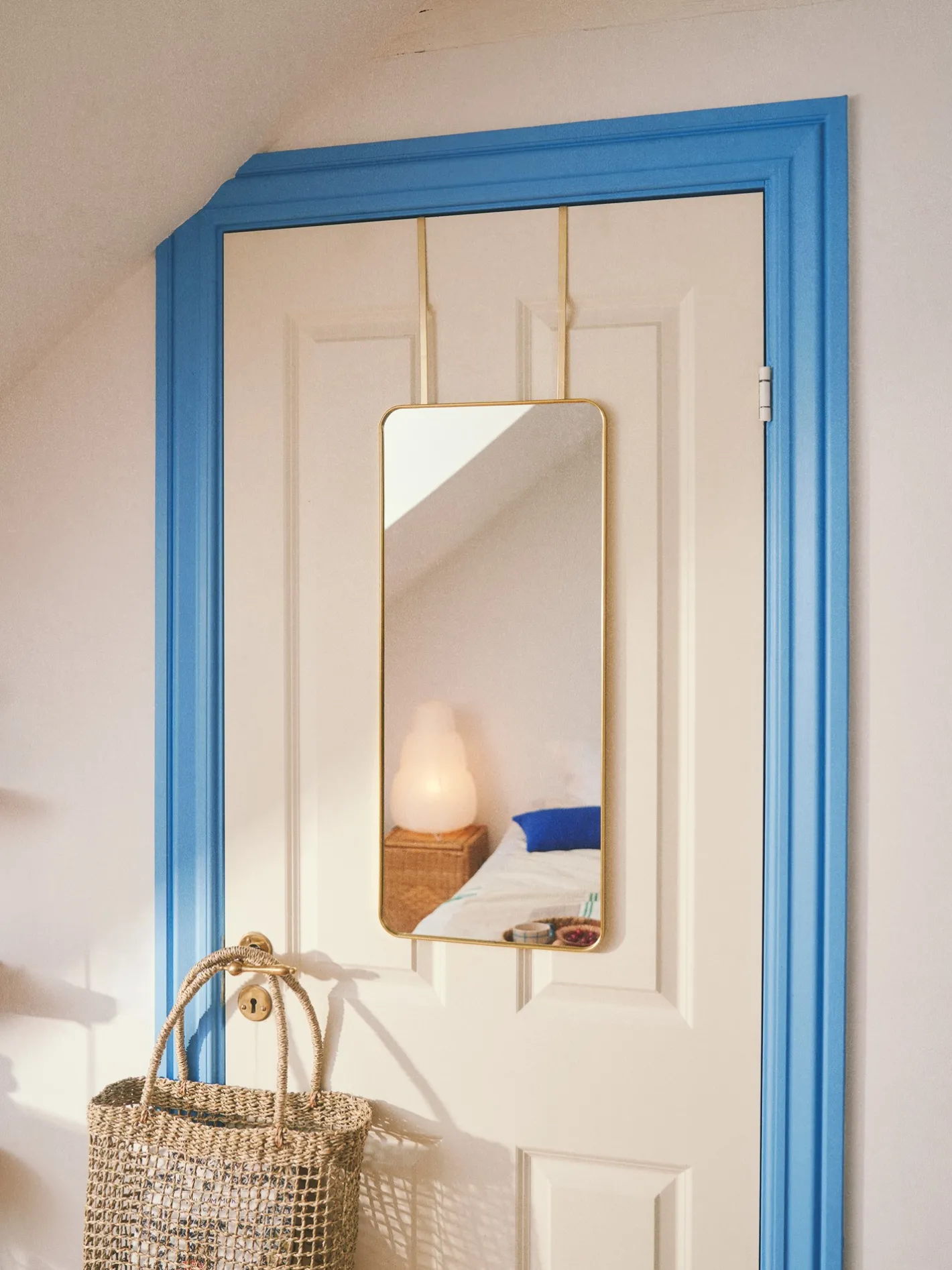 Søstrenes spejl kan hænges over en dør takket være krogene, hvilket giver en pladsbesparende og praktisk løsning til Deres hjem.Den er velegnet til døre med en maksimal tykkelse på 4 cm.
