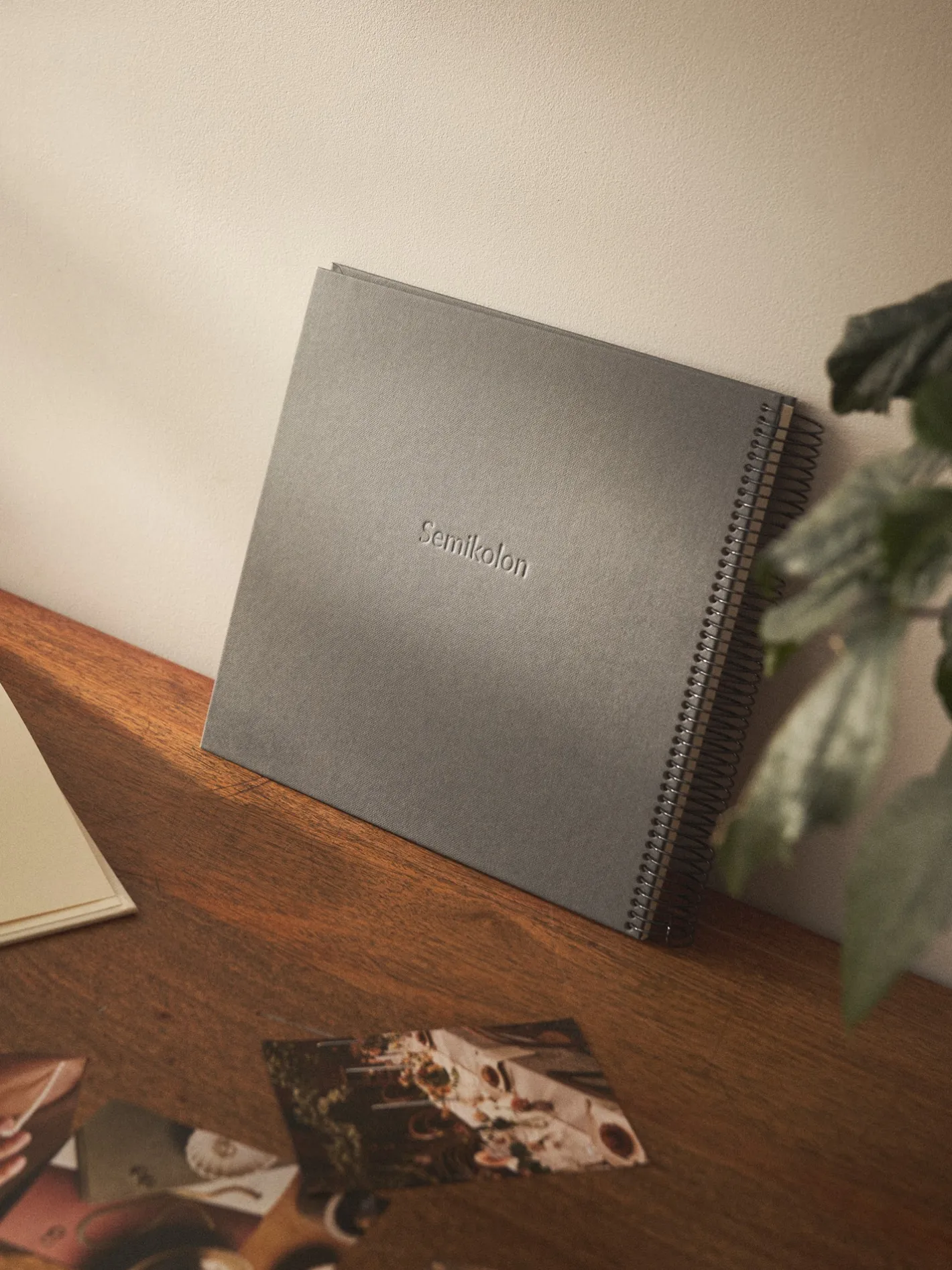 Fotoalbummet fra Semikolon består af sider af cremehvidt papir og er lærredsindbundet. Det måler 23 x 22,3 cm og har 40 sider à 270 gsm.