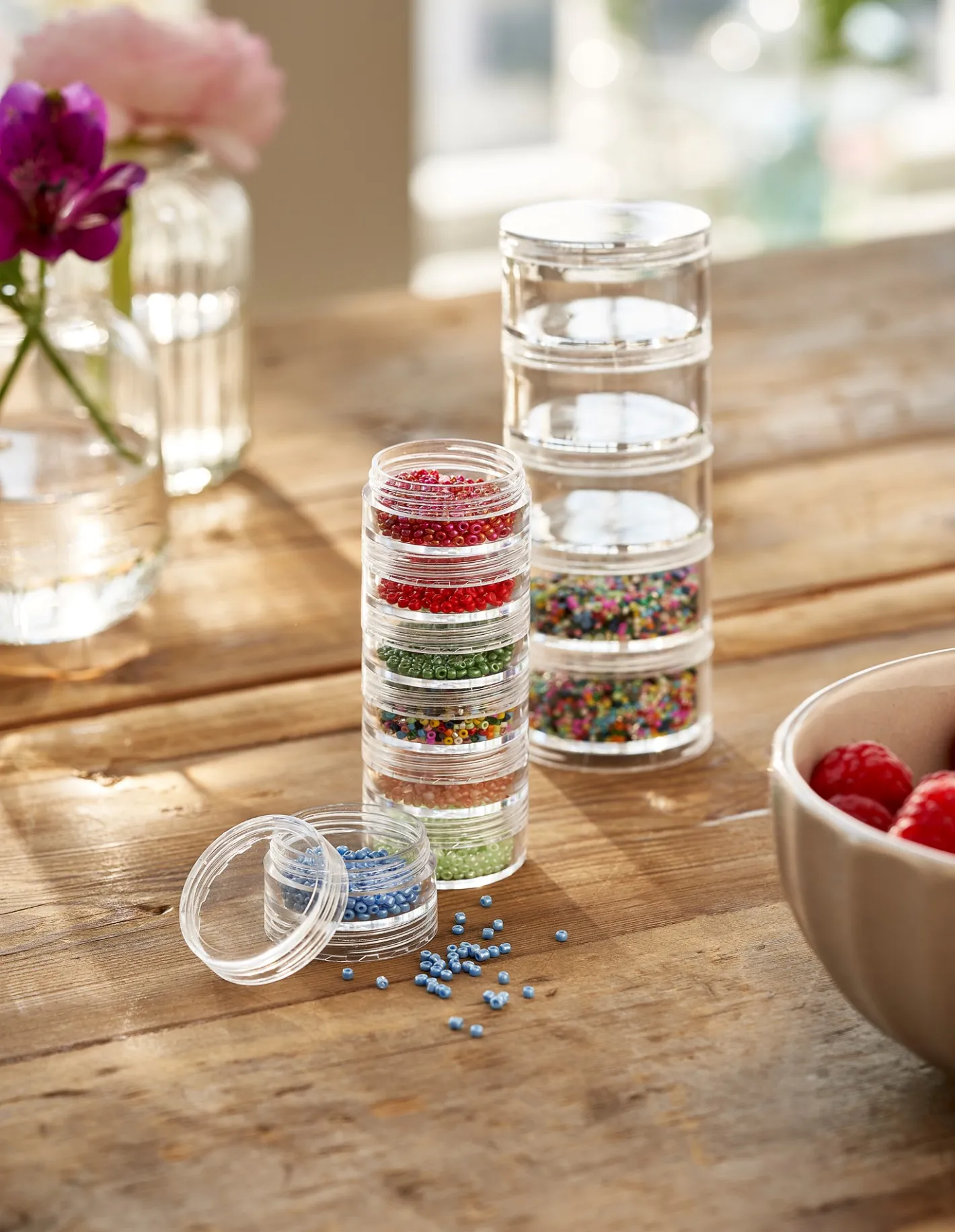 De stabelbare perlebeholdere er lavet af polystyren. Der er fem beholdere, der hver måler 5 cm i diameter, som kan fastgøres til hinanden.”Selvom beholdere som disse ofte bruges til opbevaring af perler, kan De også bruge dem til at opbevare Deres glimmer, knapper og andre kreative artikler,” foreslår Anna.