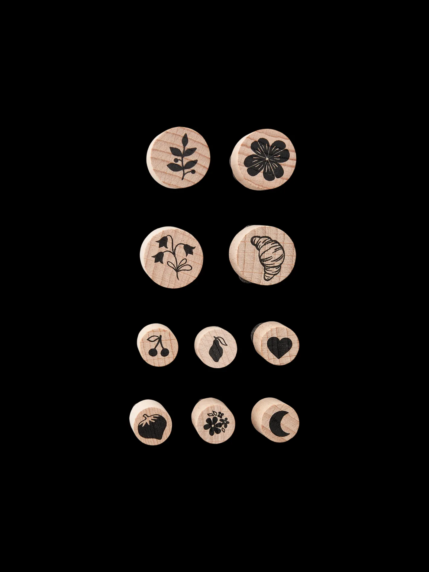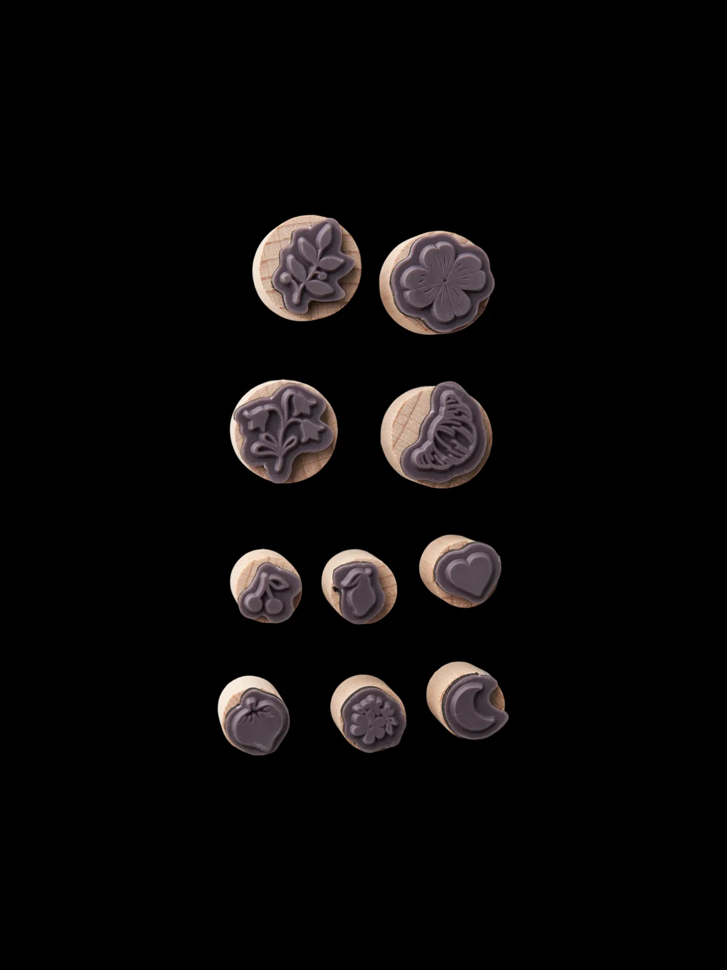 Søstrenes stempler er lavet af FSC®-certificeret birketræ og gummi. Sættet består af 6 stempler med en diameter på 13 mm og 4 stempler med en diameter på 20 mm.