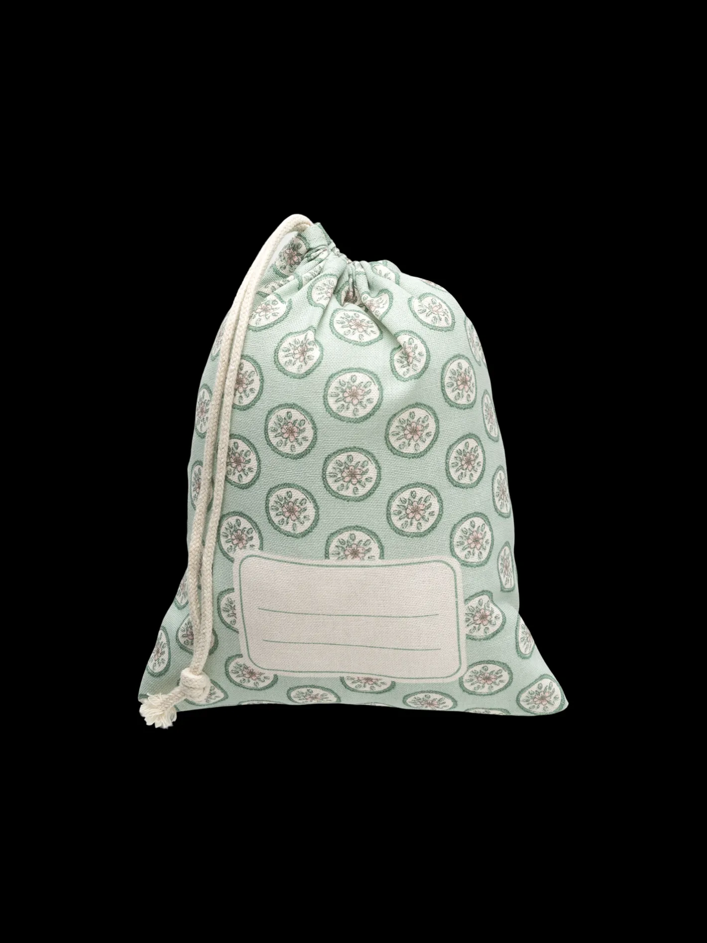 Søstrenes stofpose er lavet af STANDARD 100 by OEKO-TEX®-certificeret bomuld. Den har et mærkat, så De kan skrive navn eller indhold med en tekstilmarkør.