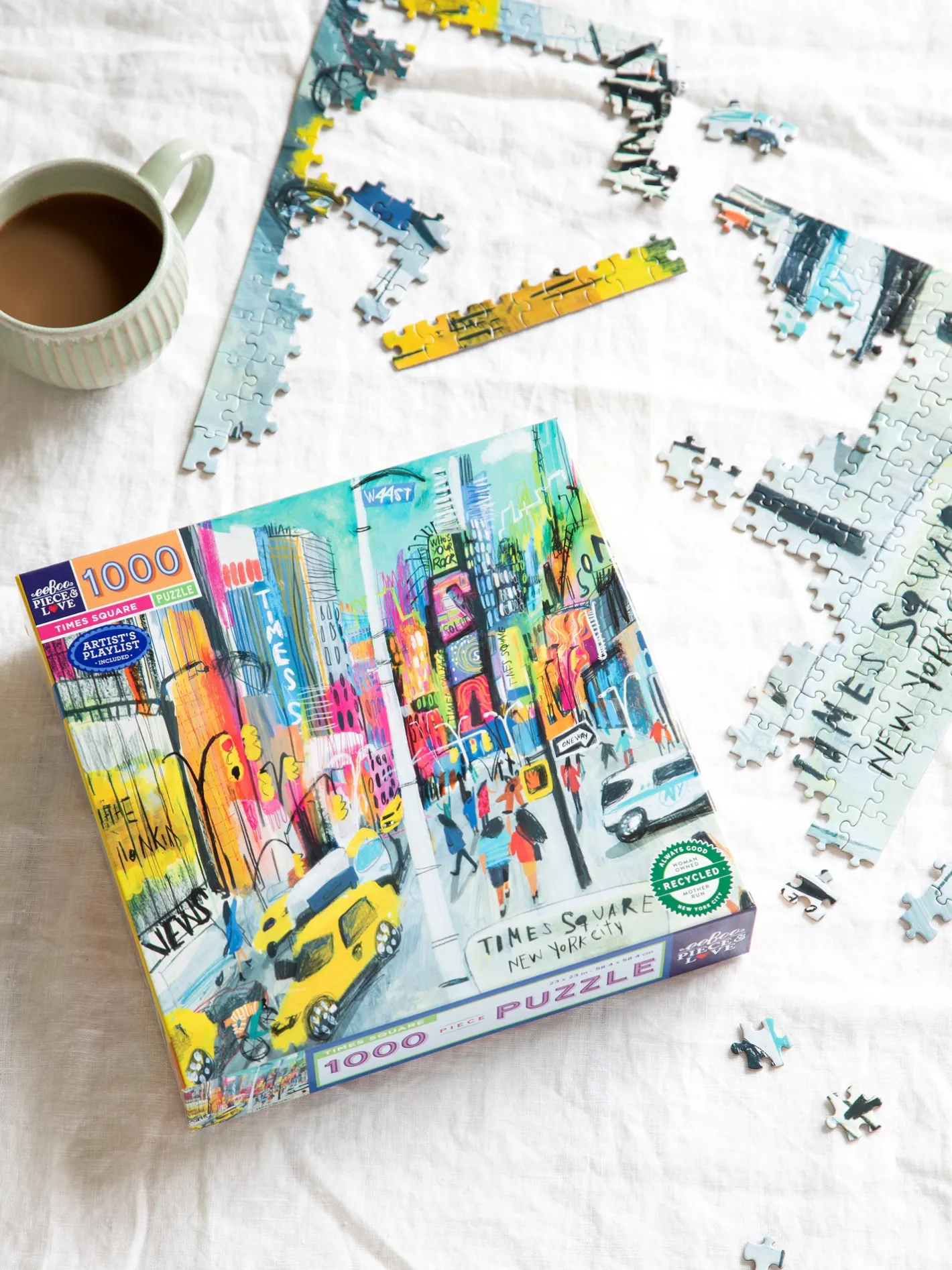 Time Square-puslespillet fra eeBoo er lavet af papir og måler 58,4 x 58,4 cm, når det er samlet. Puslespillet har 1000 brikker. Illustrationen er lavet af Maru Godas.