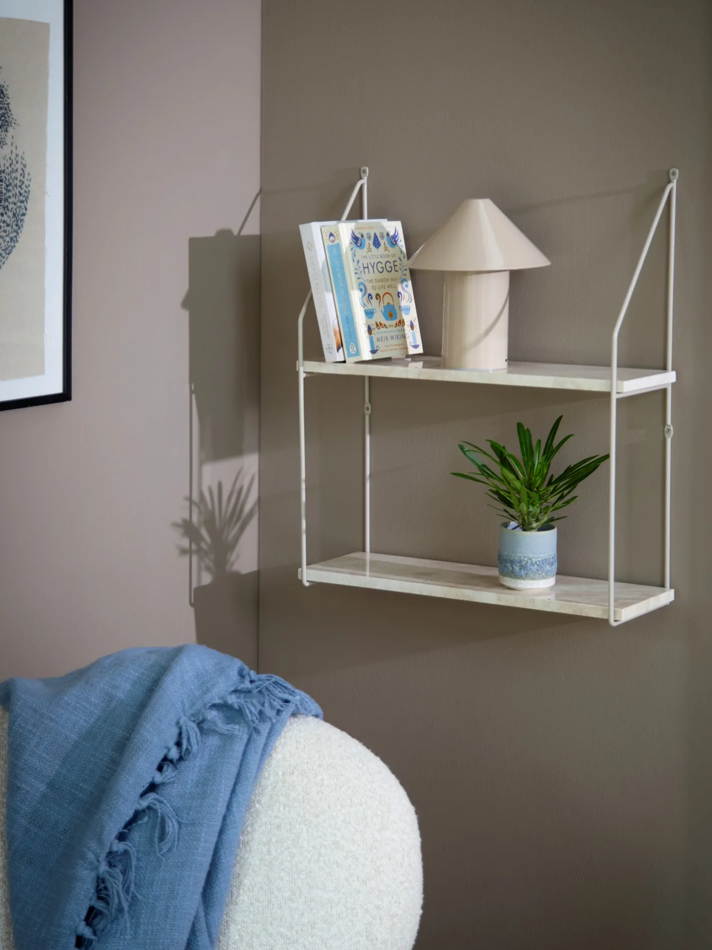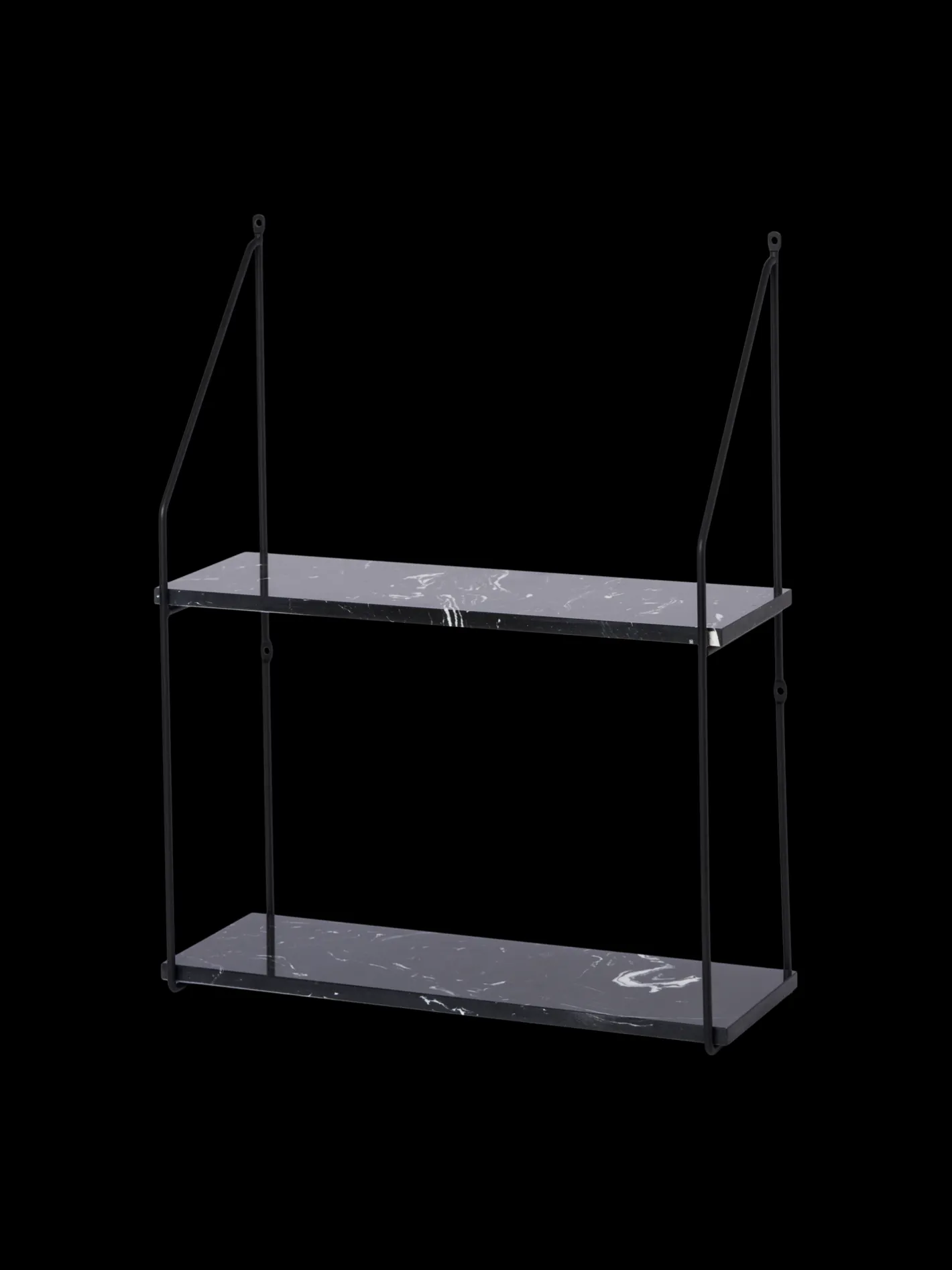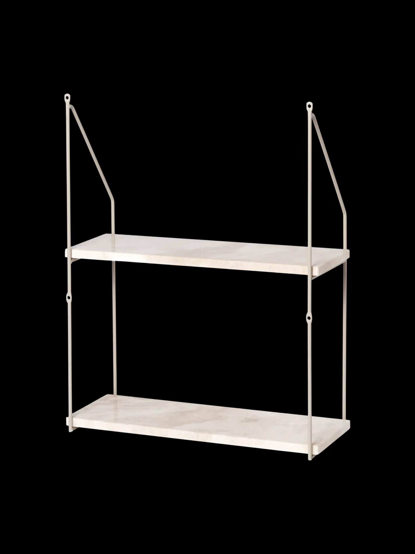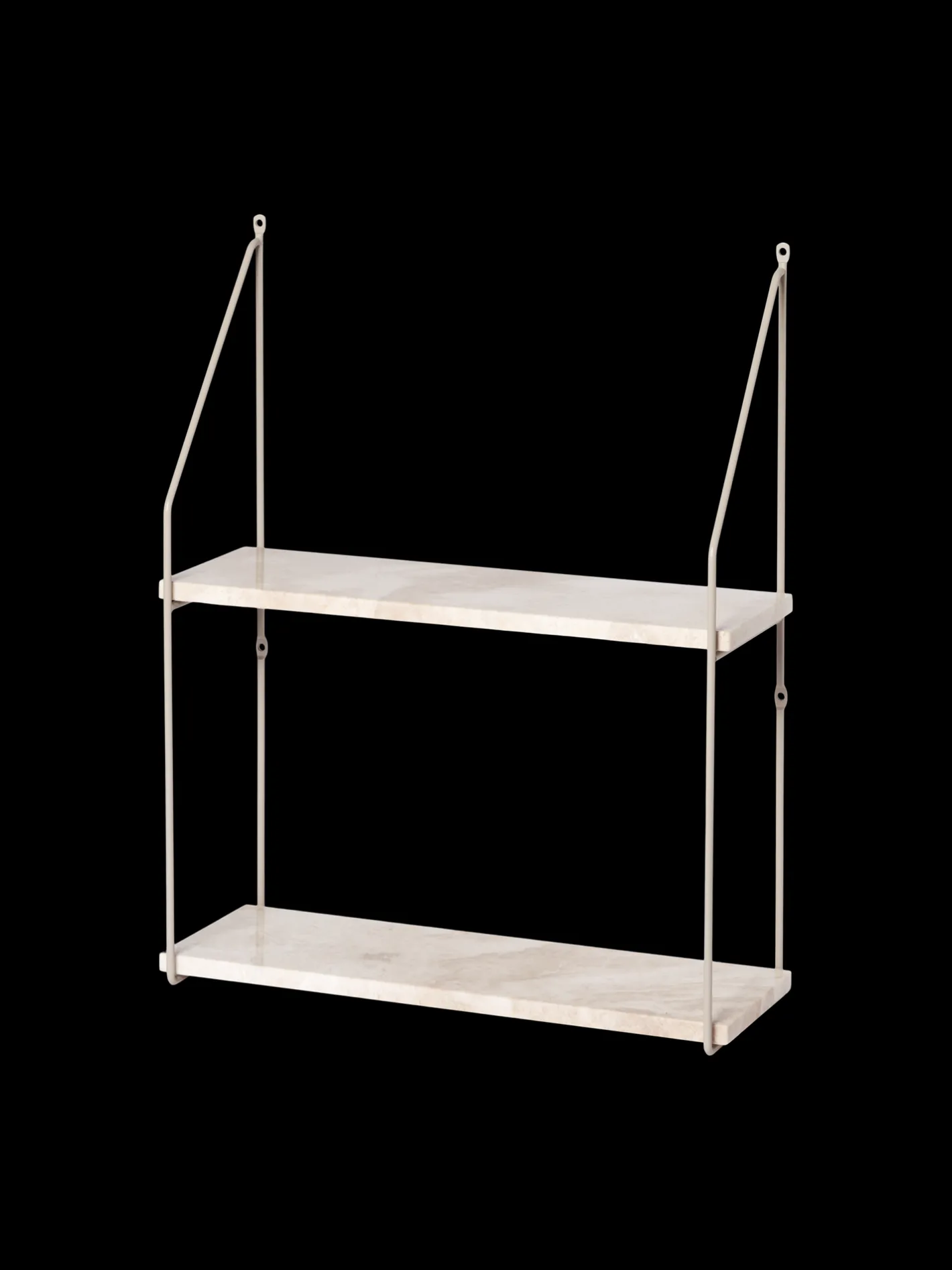 Søstrenes vægstativ er lavet af marmor med jernbeslag. Reolen har to hylder.Da marmor er et naturmateriale, gør søstrene opmærksom på, at produktet kan variere en smule i farven og udtrykket.