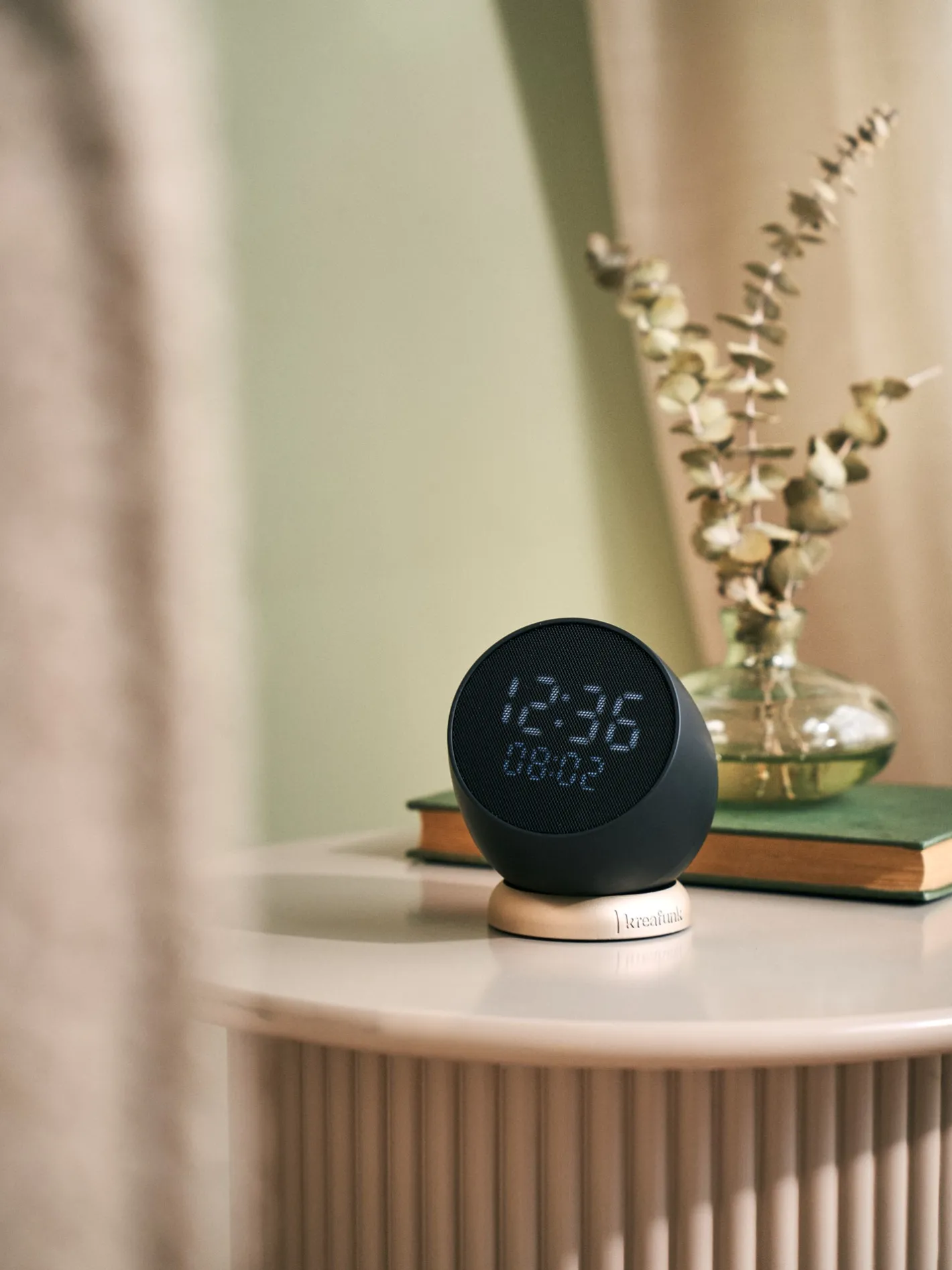 Dette vækkeur fra det danske mærke Kreafunk har et stilfuldt og intuitivt design og er drejeligt i bunden for at give mulighed for nem omplacering. Vækkeuret er lavet af ABS-plast samt metal og silikone.Sluk alarmen om morgenen med et enkelt tryk på en knap, eller vend den blot om for at udsætte den. Vækkeuret fungerer også trådløst med en fuld opladning på 1 til 2 timer og en driftstid på op til 30 dage.