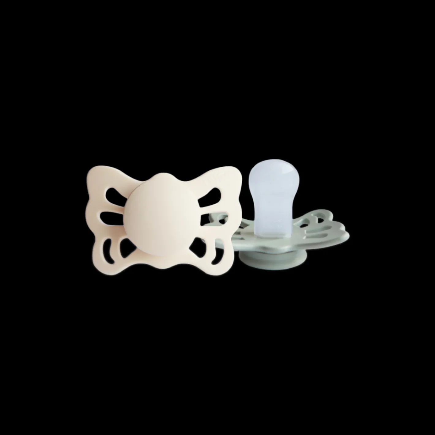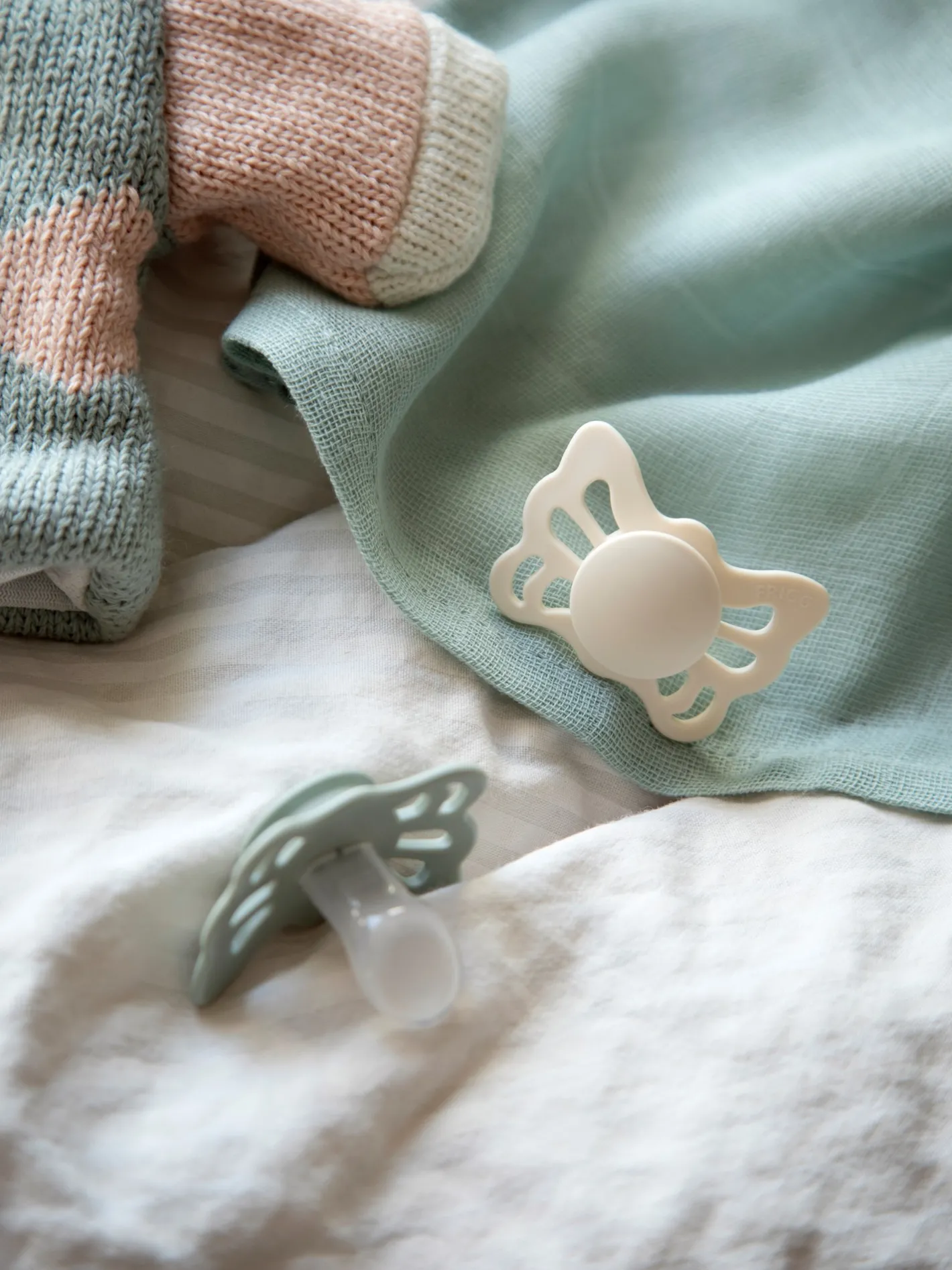 Butterfly-sutterne fra det danske mærke FRIGG er designet og produceret i Danmark. Pakken indeholder 2 FRIGG-sutter. Sutterne har låsemekanismen click-lock® og en ny SilkySoft™ overflade. Sutten er lavet af medicinsk silikone og kommer i en størrelse 1, ideel til alderen 0-6 måneder. Sutten har en anatomisk form og måler 27 mm. Butterfly-sutterne fra FRIGG har form som en sommerfugl. Denne pakke indeholder en Cream-farvet sut og en Sage-farvet sut. Søstrene gør opmærksom på, at sutterne bør udskiftes hver 4.-8. uge af hygiejniske årsager og for optimal sikkerhed. De bør altid tjekke sutten før brug og kassere den ved første tegn på beskadigelse eller slid.