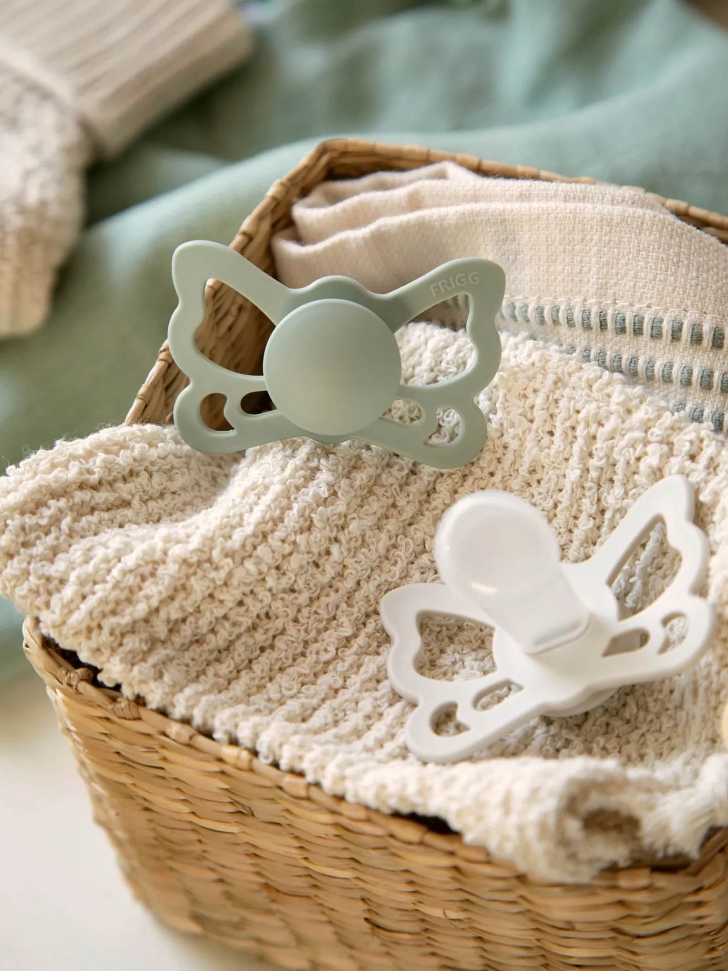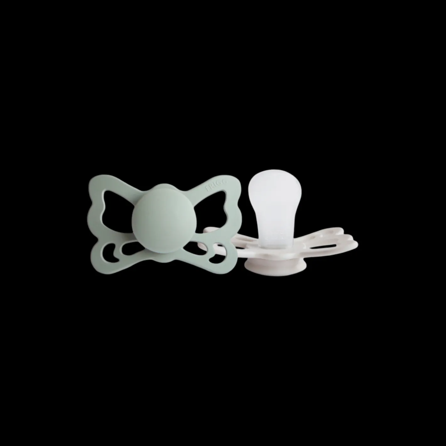 Butterfly-sutterne fra det danske mærke FRIGG er designet og produceret i Danmark. Pakken indeholder 2 FRIGG-sutter. Sutterne har låsemekanismen click-lock® og en ny SilkySoft™ overflade. Sutten er lavet af medicinsk silikone og kommer i en størrelse 2, ideel til alderen 6-18 måneder. Sutten har en symmetrisk form og måler 27 mm. Butterfly-sutterne fra FRIGG har form som en sommerfugl. Denne pakke indeholder en Sage-farvet sut og en Silver Gray-farvet sut. Søstrene gør opmærksom på, at sutterne bør udskiftes hver 4.-8. uge af hygiejniske årsager og for optimal sikkerhed. De bør altid tjekke sutten før brug og kassere den ved første tegn på beskadigelse eller slid.