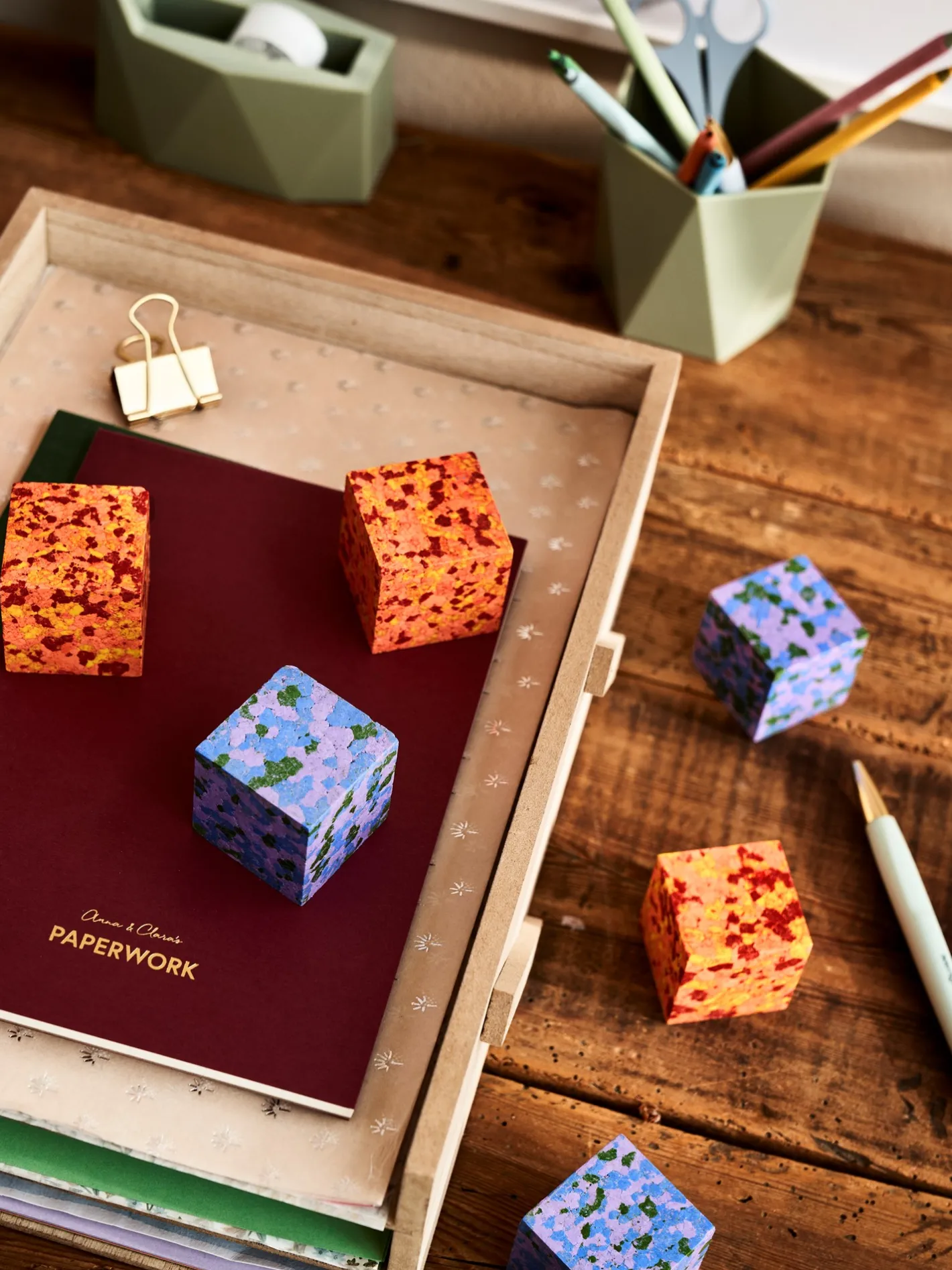 Søstrenes konfetti-farvekridt er terningformede og måler 4 x 4 x 4 cm. Hver farveblyant består af 3 forskellige farver.