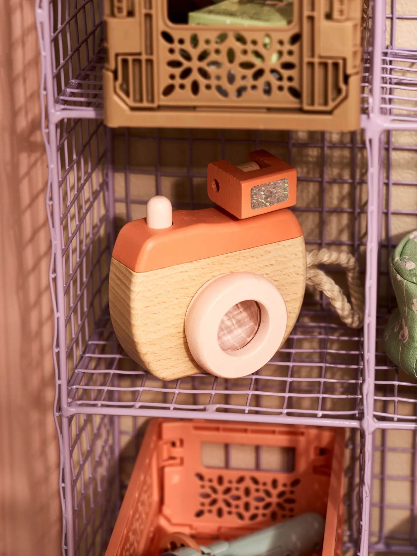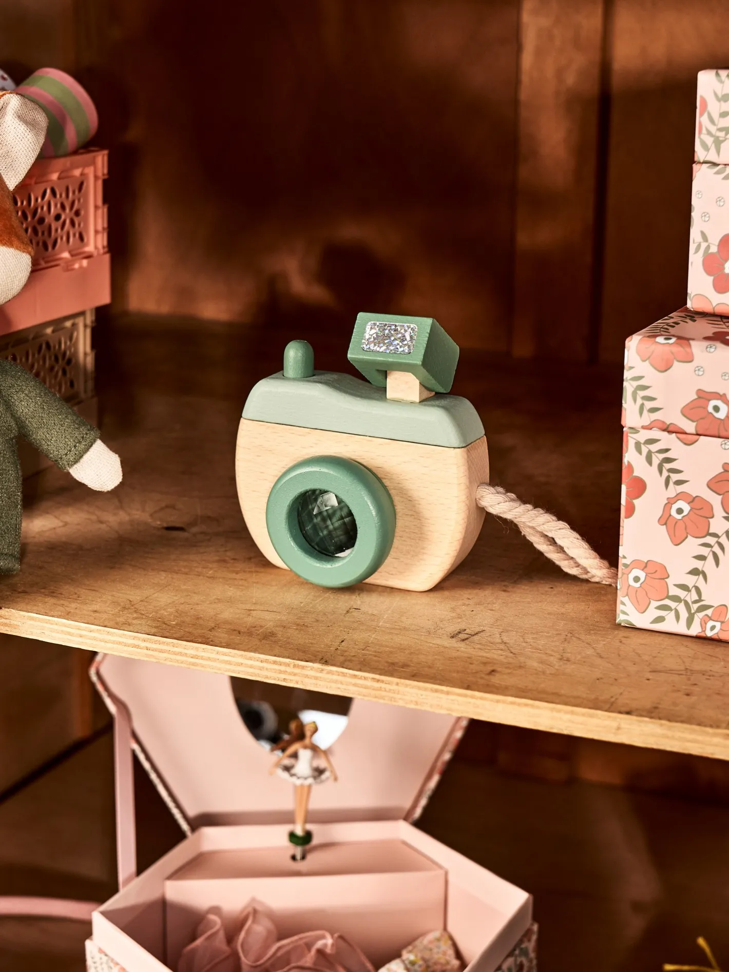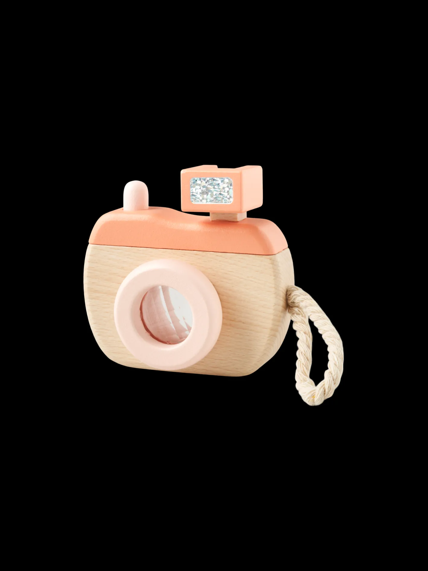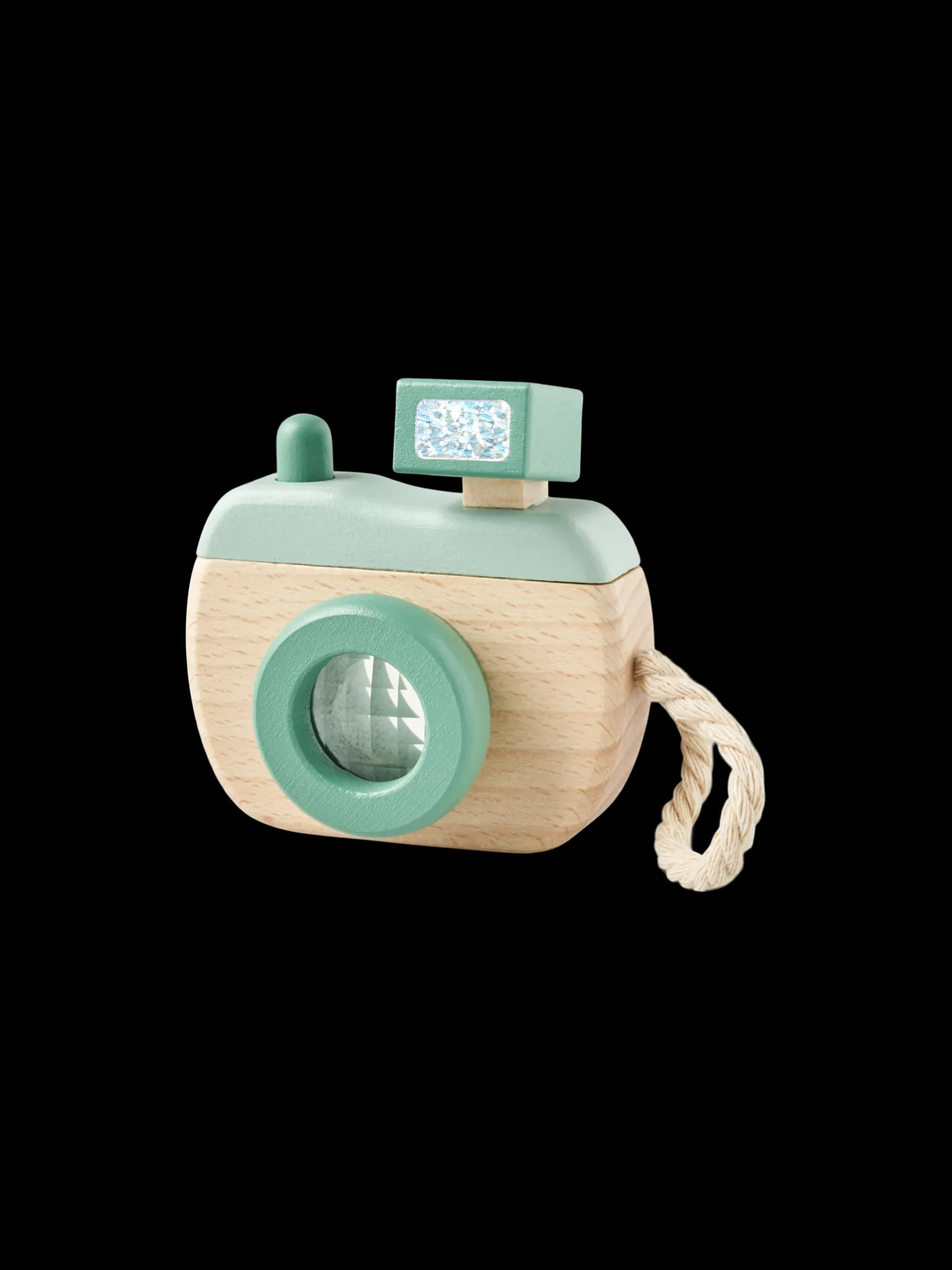 Søstrenes legetøjskamera er lavet af 100% FSC®-certificeret bøgetræ og har en kort bomuldsrem, der gør det nemt at holde. Den måler 11,5 x 8,5 x 4 cm.
