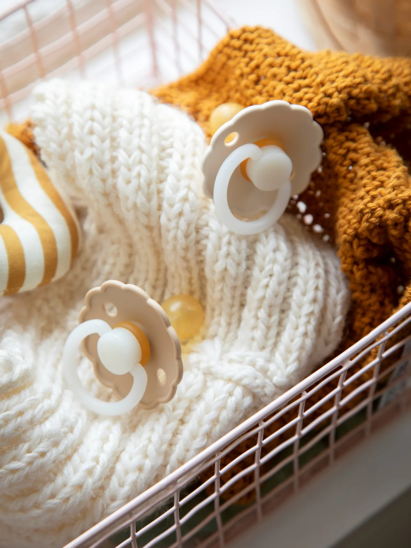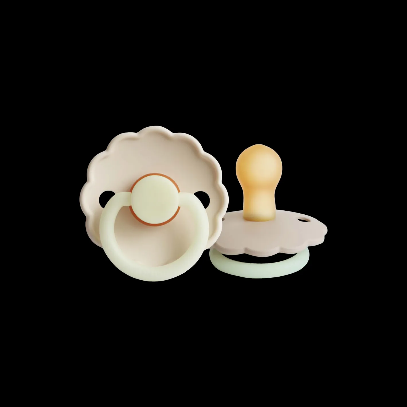 Daisy-sutterne fra det danske mærke FRIGG er designet og produceret i Danmark. Pakken indeholder 2 FRIGG-sutter. Sutterne har låsemekanismen click-lock® og en ny SilkySoft™ overflade. Sutten er lavet af 100% naturgummi og kommer i en størrelse 2, ideel til alderen 6-18 måneder. Sutten er rund og måler 30 mm. Sutterne er også udstyret med en blid, selvlysende funktion, der ikke skader den lilles øjne. Håndtaget og knoppen kan lyse i mørke og dermed hjælpe med at finde, og give, din babys sut midt om natten.Daisy-sutterne fra FRIGG har yndige, flossede kanter, der minder om en særlig blomst: Tusindfryden, som er Danmarks nationalblomst. Denne pakke indeholder en Cream-farvet sut og en Croissant Night-farvet sut. Søstrene gør opmærksom på, at sutterne bør udskiftes hver 4.-8. uge af hygiejniske årsager og for optimal sikkerhed. De bør altid tjekke sutten før brug og kassere den ved første tegn på beskadigelse eller slid.