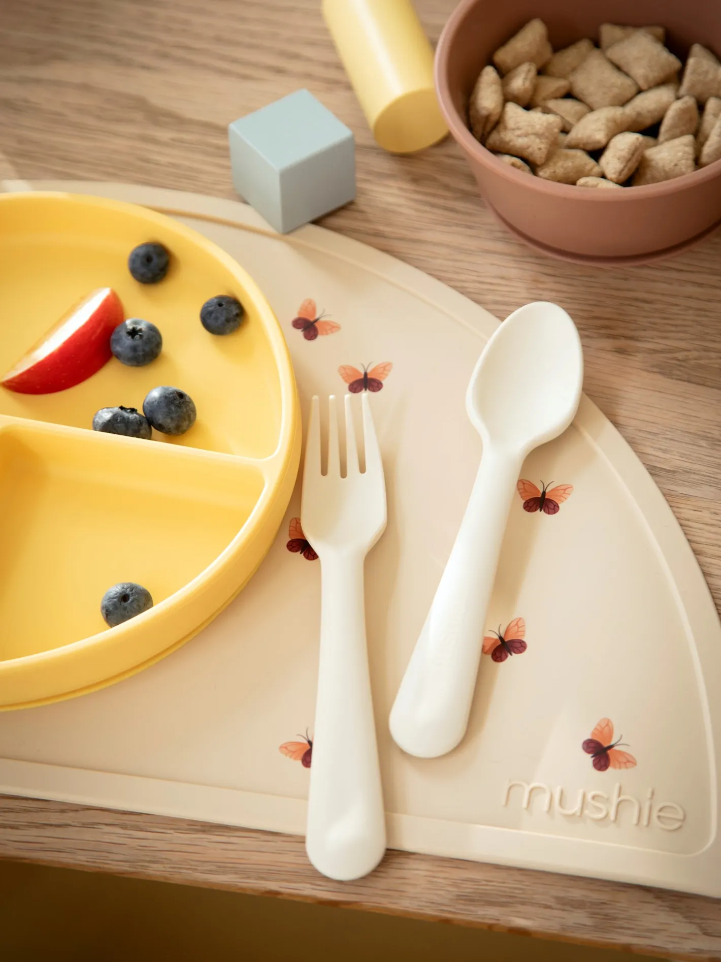 Ske og gaffel-sættet fra Mushie er enkelt og elegant. De er nemme at holde om for Deres barn. Dette sæt er fremstillet i Danmark og tåler opvaskemaskine, hvilket gør oprydningen lidt nemmere. Bemærk venligst, at produktet altid skal bruges under opsyn af en voksen. Undersøg produktet før hver brug. Afskaf ved tegn på skade eller svaghed.