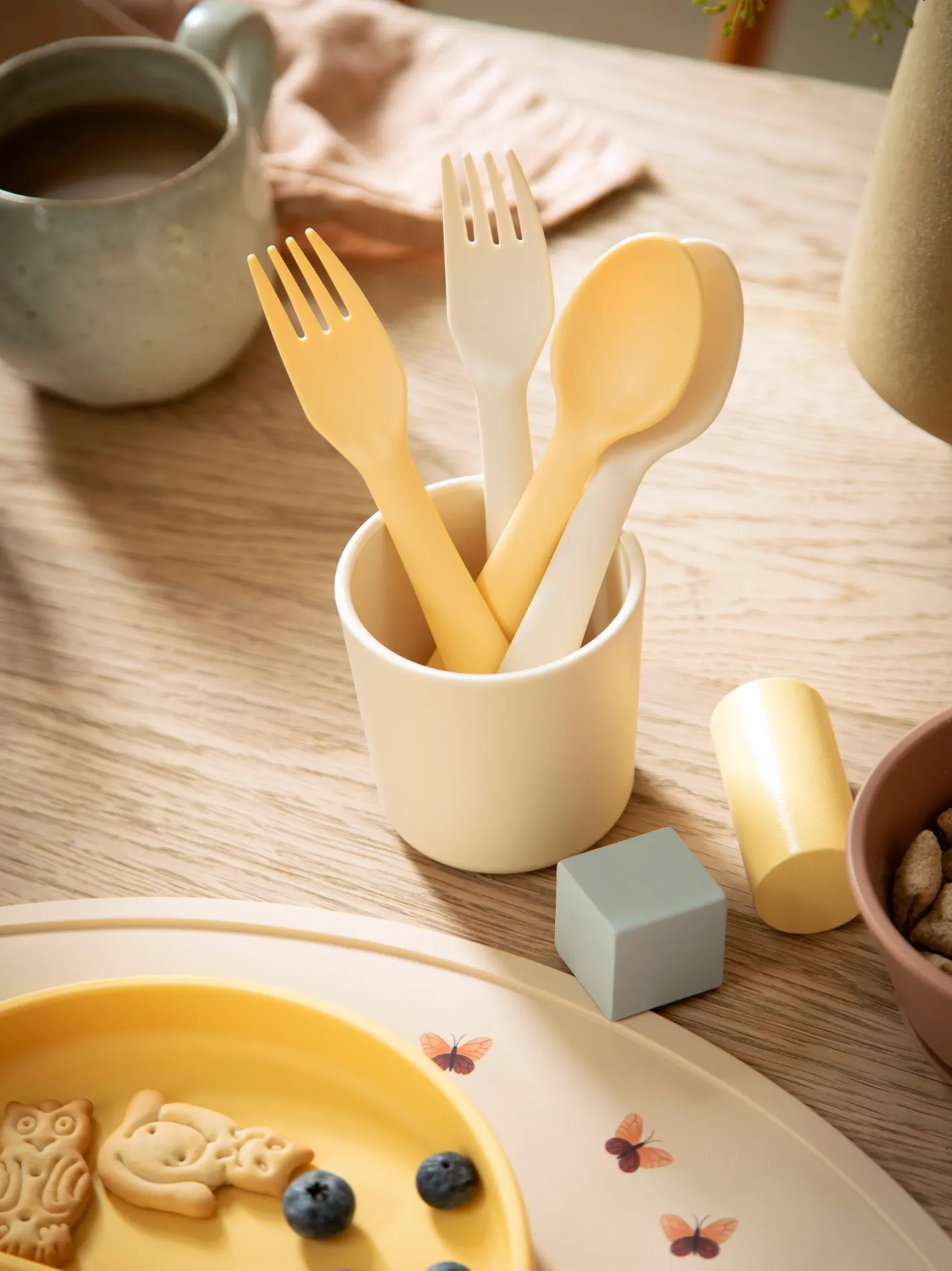 Ske og gaffel-sættet fra Mushie er enkelt og elegant. De er nemme at holde om for Deres barn. Dette sæt er fremstillet i Danmark og tåler opvaskemaskine, hvilket gør oprydningen lidt nemmere. Bemærk venligst, at produktet altid skal bruges under opsyn af en voksen. Undersøg produktet før hver brug. Afskaf ved tegn på skade eller svaghed.