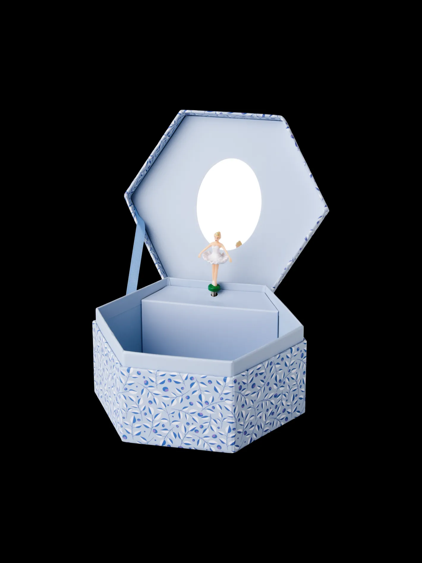 Søstrenes smykkeskrin med musik er lavet af FSC®-certificeret papir samt glas, polypropylen og polyester.Når smykkeskrinet åbnes, snurrer den lille balletdanser forsigtigt rundt til tonerne af den spillende musik.