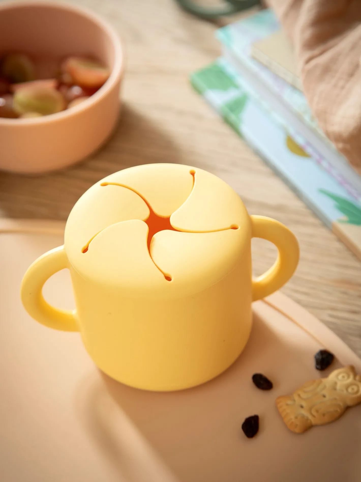 Snackkoppen fra Mushie har håndtag, der gør den ganske praktisk og nem at holde for de kære små. Koppen er lavet af fødevaregodkendt silikone.Den bløde åbning sikrer, at babys hænder let kan glide ind og ud, samtidig med at maden holdes sikkert inde. Denne snackkop er en nødvendighed for småbørn på farten. Søstrene anbefaler, at snackkoppen rengøres med varmt sæbevand og lufttørres.Bemærk venligst, at produktet altid skal bruges under opsyn af en voksen. Undersøg produktet før hver brug. Afskaf ved tegn på skade eller svaghed, og efterlad aldrig et barn uden opsyn, mens barnet bruger dette produkt. Den maksimale temperatur er 392°F (200°C).