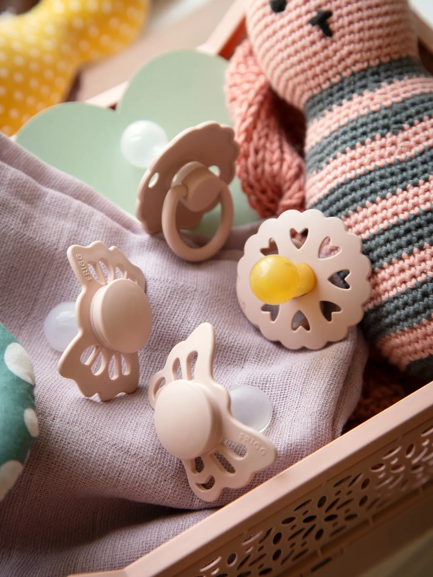 Dette sæt sutter fra det danske mærke FRIGG er designet og produceret i Danmark. Pakken indeholder 4 FRIGG-sutter: • 1 x Butterfly (anatomisk sut lavet af medicinsk silikone)• 1 x Fairytale (rund sut af naturgummi)• 1 x Daisy (rund sut lavet af medicinsk silikone)• 1 x Lucky (symmetrisk sut lavet af medicinsk silikone) Sutterne har låsemekanismen click-lock® og en ny SilkySoft™ overflade. Sættet, der består af 4 forskellige FRIGG-sutter med forskellige materialer og faconer, giver forældre mulighed for at prøve forskellige sutter for at finde ud af, hvilken deres baby bedst kan lide. Alle fire sutter kommer i en størrelse 1, ideel til alderen 0-6 måneder. Søstrene gør opmærksom på, at sutterne bør udskiftes hver 4.-8. uge af hygiejniske årsager og for optimal sikkerhed. De bør altid tjekke sutten før brug og kassere den ved første tegn på beskadigelse eller slid.