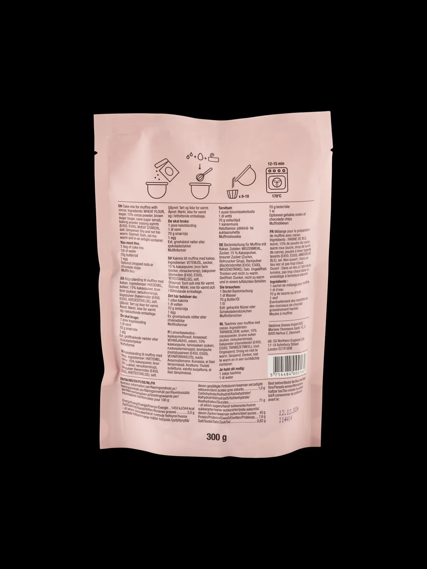 Bag nemt og bekvemt Deres egne muffins med kakao med søstrenes vindunderlige bageblanding til chokolademuffins, der kommer i en pose, der indeholder 300 g.”Bagning af vidunderlige kager er en skøn aktivitet for hele familien,” mener søstrene, der gerne lader nevøen og niecerne tage del i bagningen, inden de sammen skal nyde de hjemmebagte godter.Anna og Clara gør venligst opmærksom på, at dette produkt leveres minimum 30 dage før dets udløbsdato.
