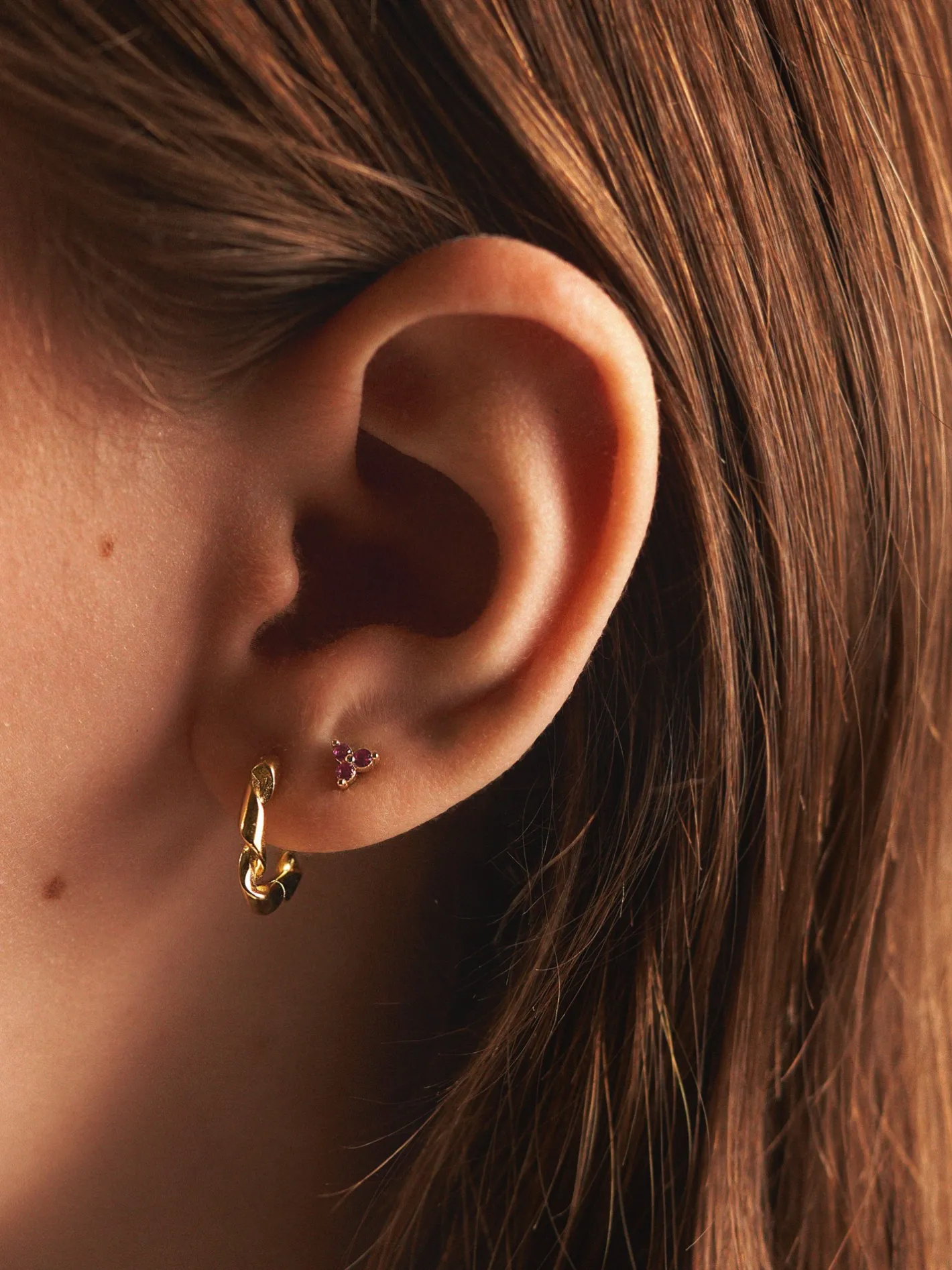 Clover-øreringene fra danske AndCopenhagen er lavet af 925 sterlingsølv, belagt med 18 karat guld, og er prydet med tre lyserøde sten. De måler 4 mm i bredden og kommer som et sæt i en smuk, lille smykkeæske. Anna og Clara gør Dem venligst opmærksom på, at smykket bør undgå direkte kontakt med fugt og væske, så guldbelægningen får en længere holdbarhed.