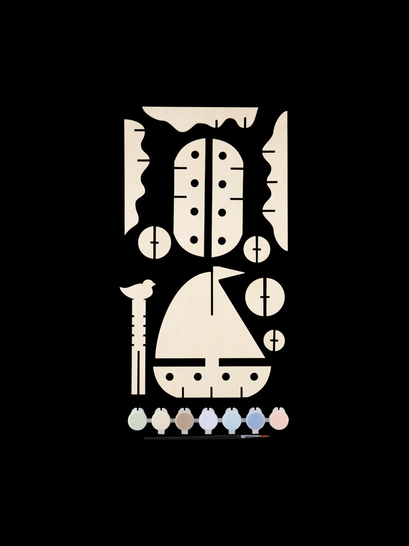 Søstrenes DIY-byggesæt i træ er 100 % FSC®-certificeret. Sættet indeholder træplader med udskårne former til at bygge et herligt skib samt en pensel og 7 stk. vandbaseret akrylmaling.