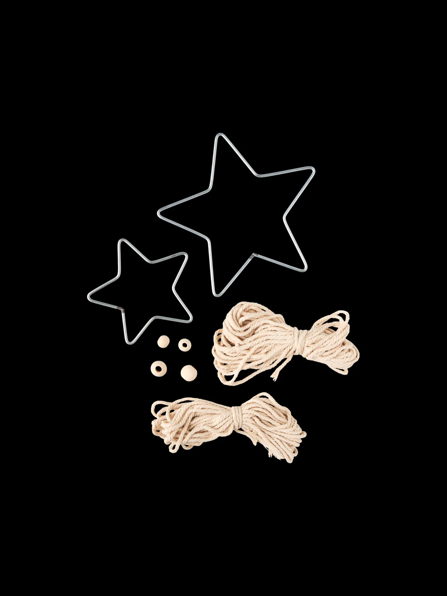 Søstrenes DIY-sæt til makramé-stjerner indeholder 2 metalstjerner på henholdsvis 10 cm og 15 cm, 4 træperler, makramé-snor og vejledning.