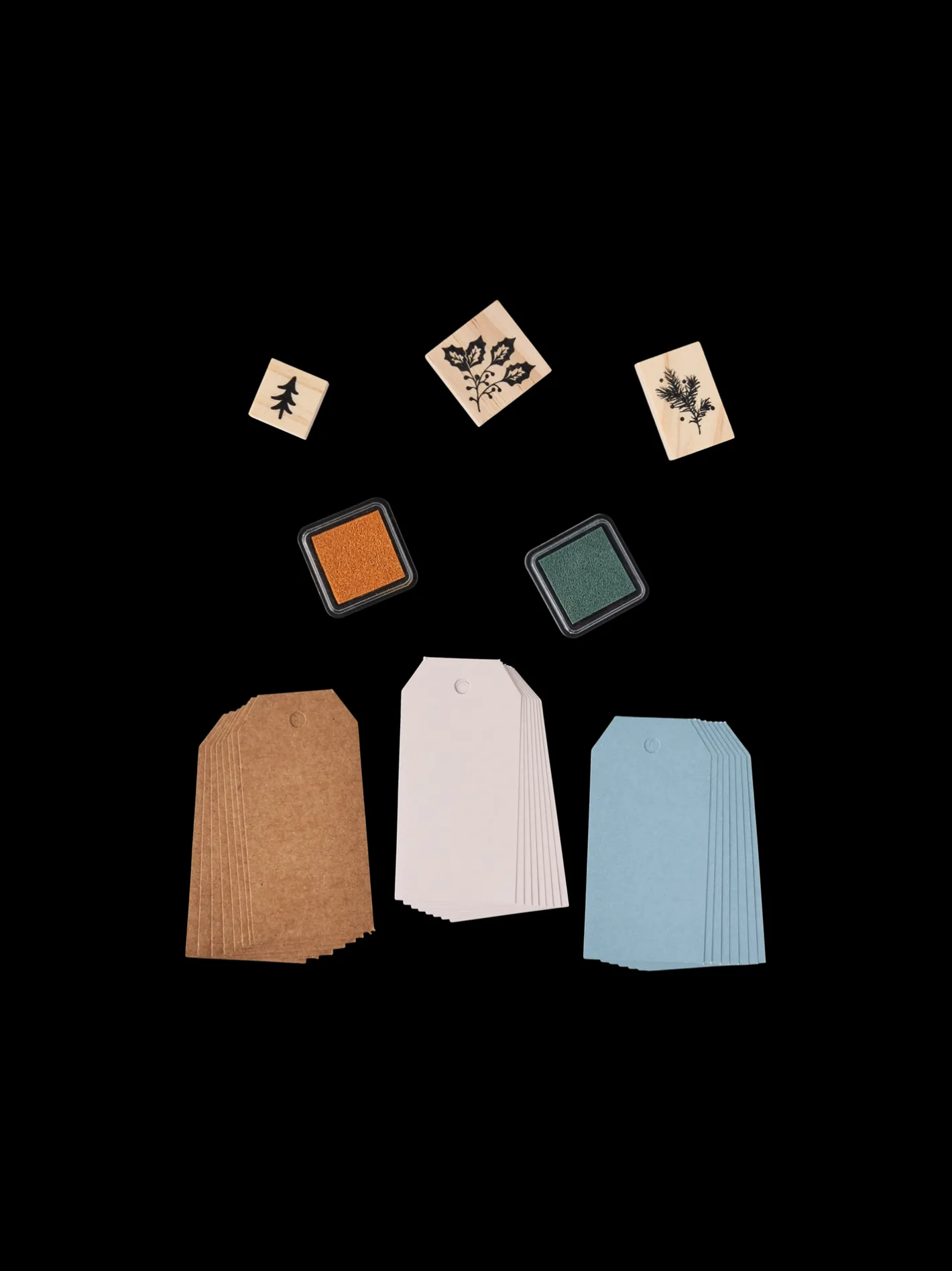 Søstrenes DIY-sæt indeholder 24 manillamærker, der er lavet af 100% FSC®-certificeret papir, samt 3 stempler og 2 stempelpuder.
