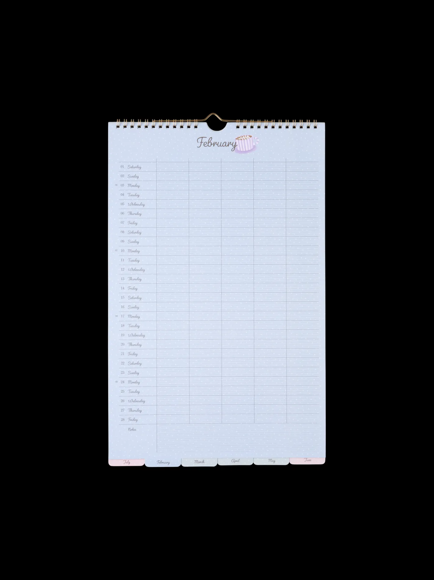 Søstrenes familiekalender er FSC®-certificeret. Den har nyttige indeksfaner for hver måned og en krog i toppen til at hænge den på væggen.