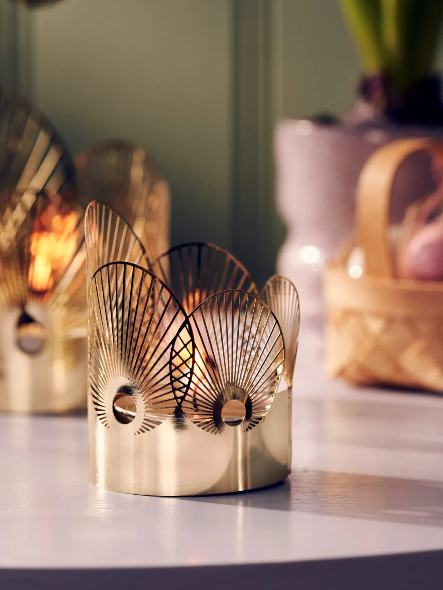 Den elegante lysestage fra det svenske mærke Pluto er en skøn tilføjelse til ethvert hjem. De gyldne gitterdetaljer reflekterer lyset smukt og skaber charmerende blafrende skygger.Søstrene bemærker venligt, at denne lysestage kommer med 1 fyrfadslys.