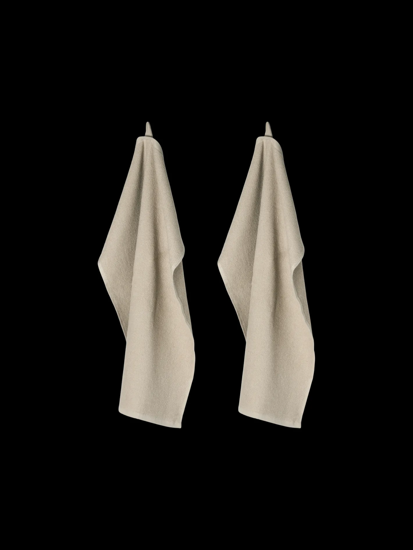 Søstrenes håndklæder er lavet af bomuld og måler 70 x 50 cm. Clara indretter sit badeværelse med et duftlys, en lille plante og sine nye, bløde håndklæder. “Bløde materialer skaber en følelse af hverdagsluksus,” siger hun.