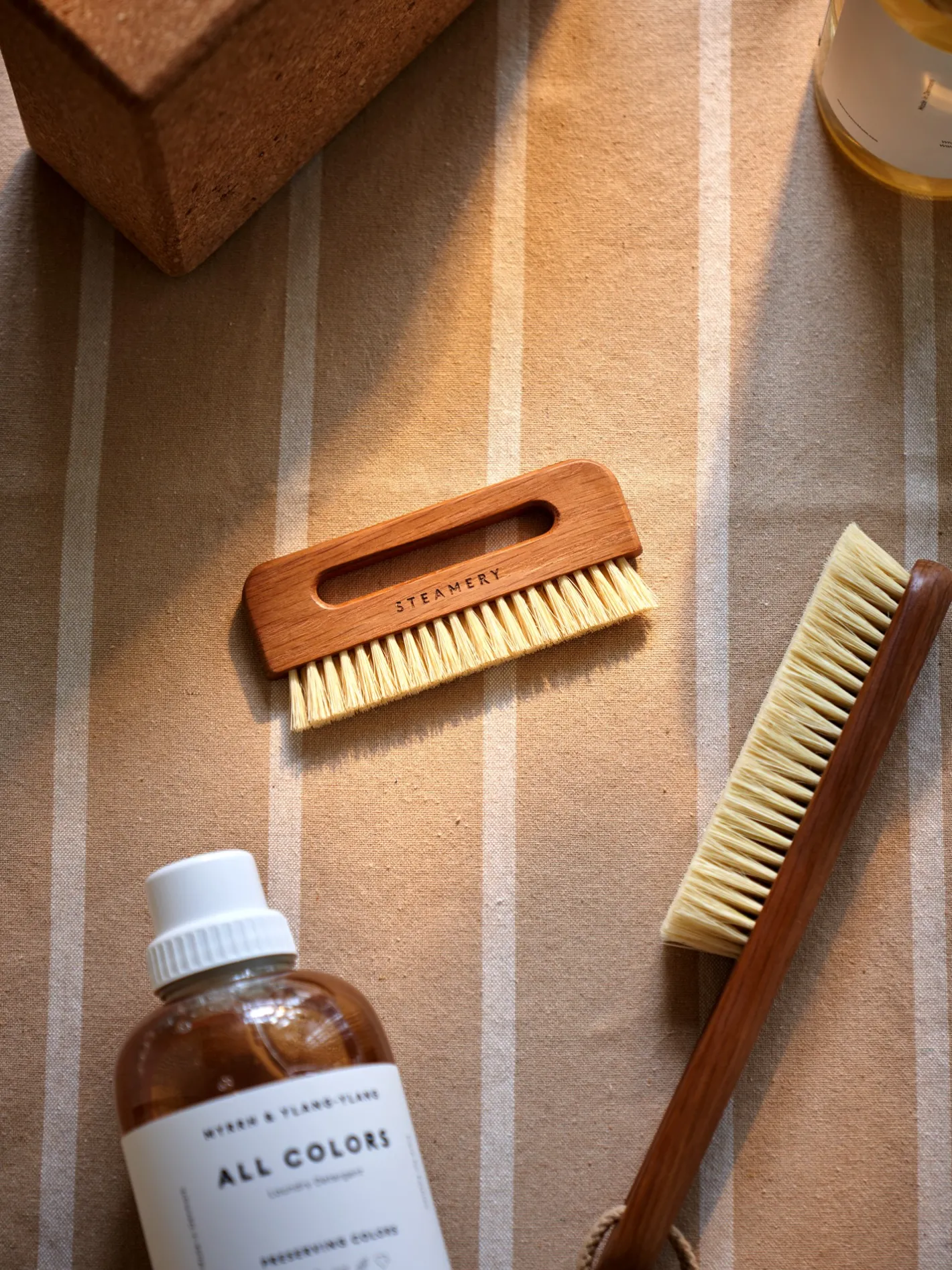 Søstrene gør Dem venligst opmærksom på, at denne vare kun forhandles online. Klædebørsten fra Steamery er et klassisk og smukt alternativ til fnugrullen i plastik. Den har et håndtag lavet af egetræ med en finish af mørk voksolie og børster af sisalfibre. Den måler 1,1 x 6 x 12,9 cm. Den passer i lommen, hvilket gør den ideel til, når De er på farten. “Den fjerner forsigtigt støv, snavs og hår fra tøj og tekstiler i hjemmet,” forklarer Clara med et smil. “Et par strøg burde være tilstrækkeligt.”Anna og Clara bemærker venligt, at klædebørsten er særlig nyttig på stoffer som denim, bomuld, overtøj eller tekstiler i hjemmet, men ikke er egnet på sarte stoffer som silke og chiffon.