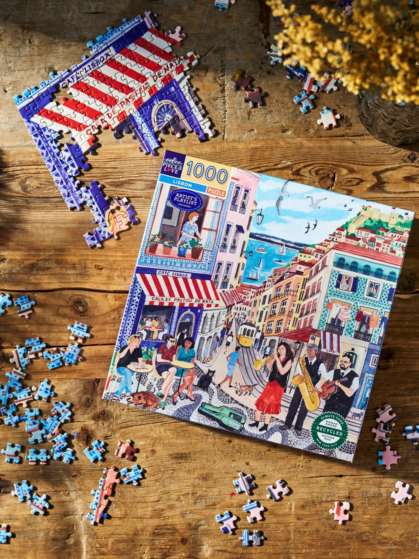 Søstrene gør Dem venligst opmærksom på, at denne vare kun forhandles online.Lissabon-puslespillet fra eeBoo er lavet af papir og måler 58,4 x 58,4 cm, når det er samlet. Puslespillet har 1000 brikker. Illustrationen er af Miranda Sofroniou.Hvad end de hygger sig indenfor på regnvejrsdage eller sidder på terrassen, når solen skinner, finder Anna og Clara stor fornøjelse i at lægge puslespil sammen. “Det er en beroligende aktivitet, som giver masser af plads til at småsnakke, alt imens man lægger puslespillet,” siger Clara.Hun samler metodisk brikkerne, der danner rammen om puslespillet, mens Anna forsøger at finde farver og former, der lader til at passe sammen. De har hver deres tilgang til at lægge puslespil, og sammen tilbringer de en harmonisk eftermiddag.”Det er altid en stor glæde, når det endelige resultat afsløres, og man kan fordybe sig i de skønne små detaljer i billedet,” siger Anna med et smil.